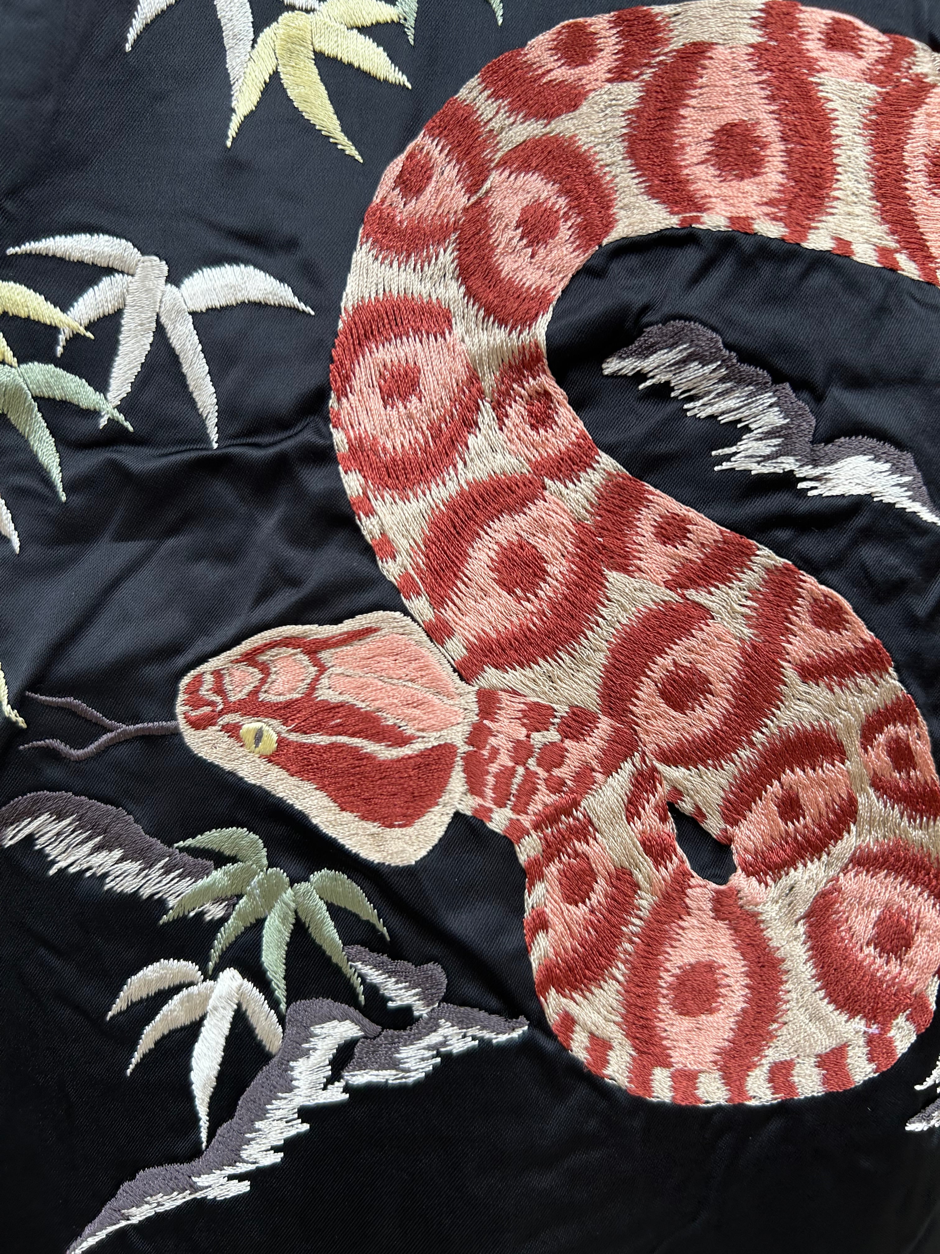 表面は獲物を求めて彷徨うマムシ(ピットバイパー)を描いた1950年代初期の絵柄。蛇行する身体の動きに合わせて刺繍の針足を変えることで躍動感を表現し、特徴的な銭形模様(円の中に点のある模様)は横振り刺繍を重ねて立体感を強調することで、迫り来るマムシの迫力を見事に描き出している。竹や葉には色糸を複数使い、ホワイトからグリーンに至るグラデーションで奥行きのある夜の竹林を表現。ブラックxゴールドで色合わせさせたボディとリブに対し、紅白のパイピングがアクセントになっている。