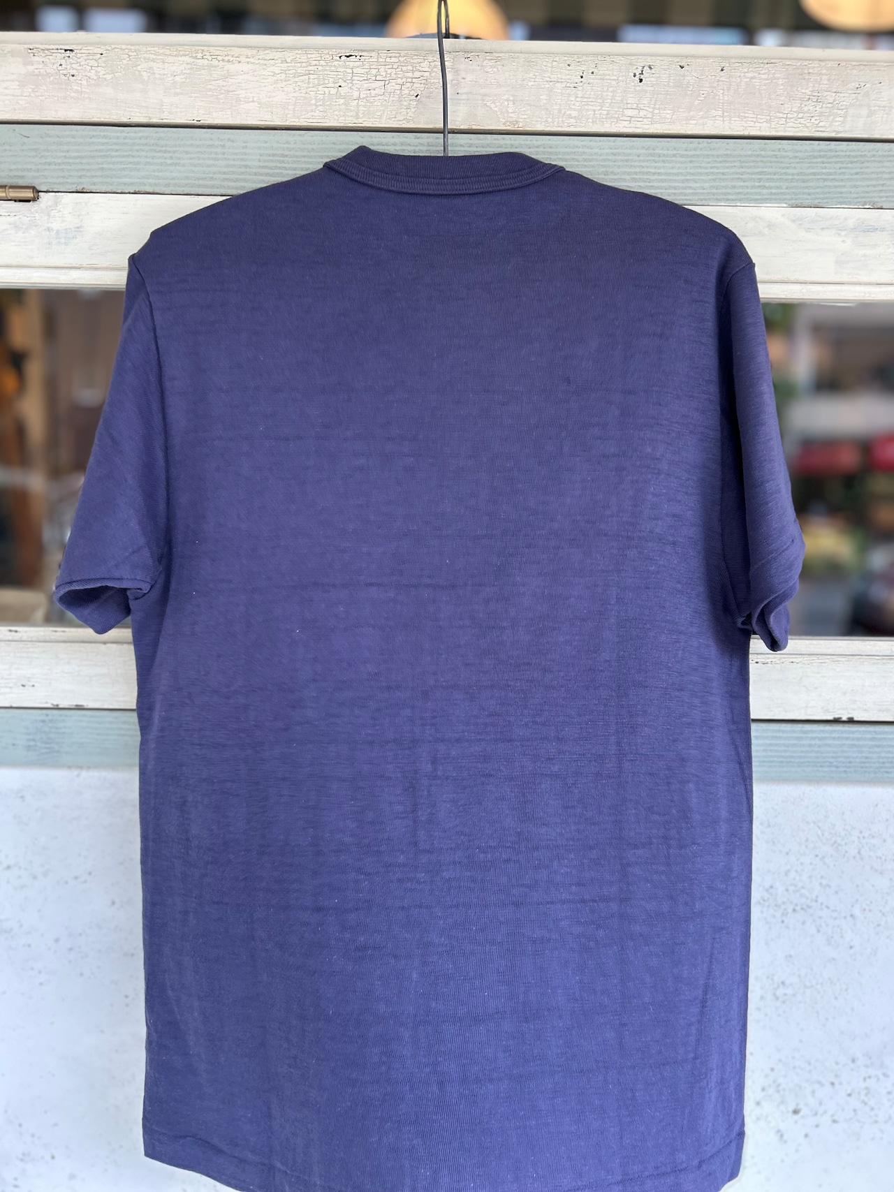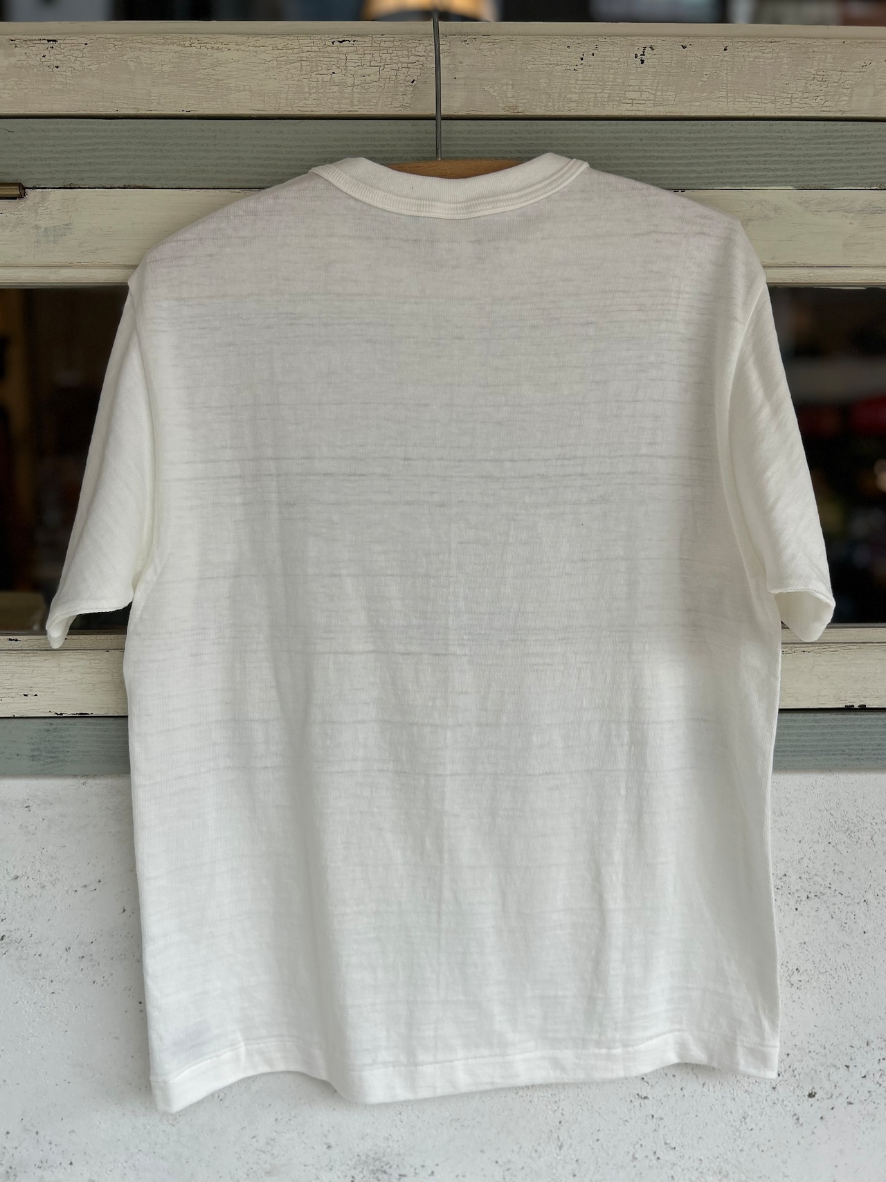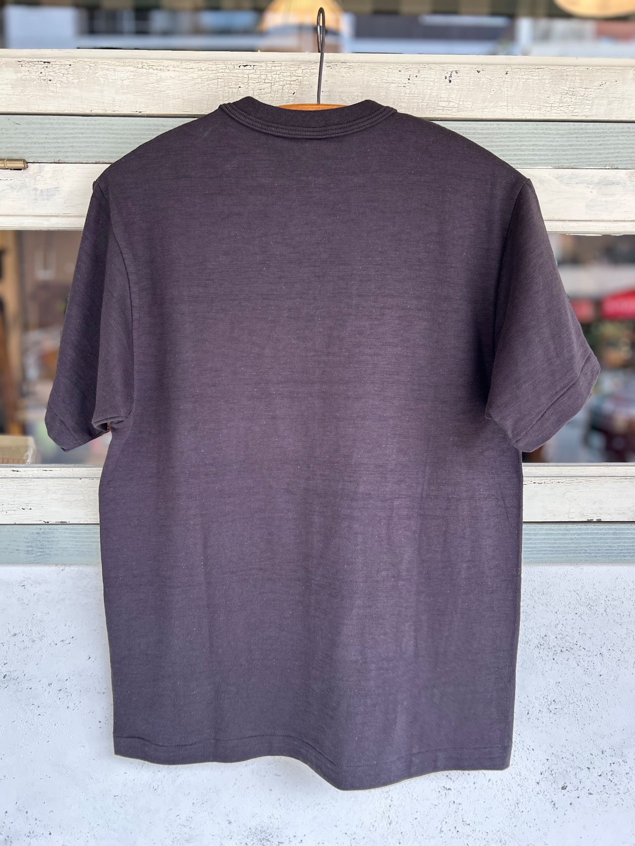 12番のムラ糸で独特の陰影が出るように編まれた生地はシャドウボーダーと呼ばれており、無地でありながらうっすらと横段のようなムラが浮かび上がります。