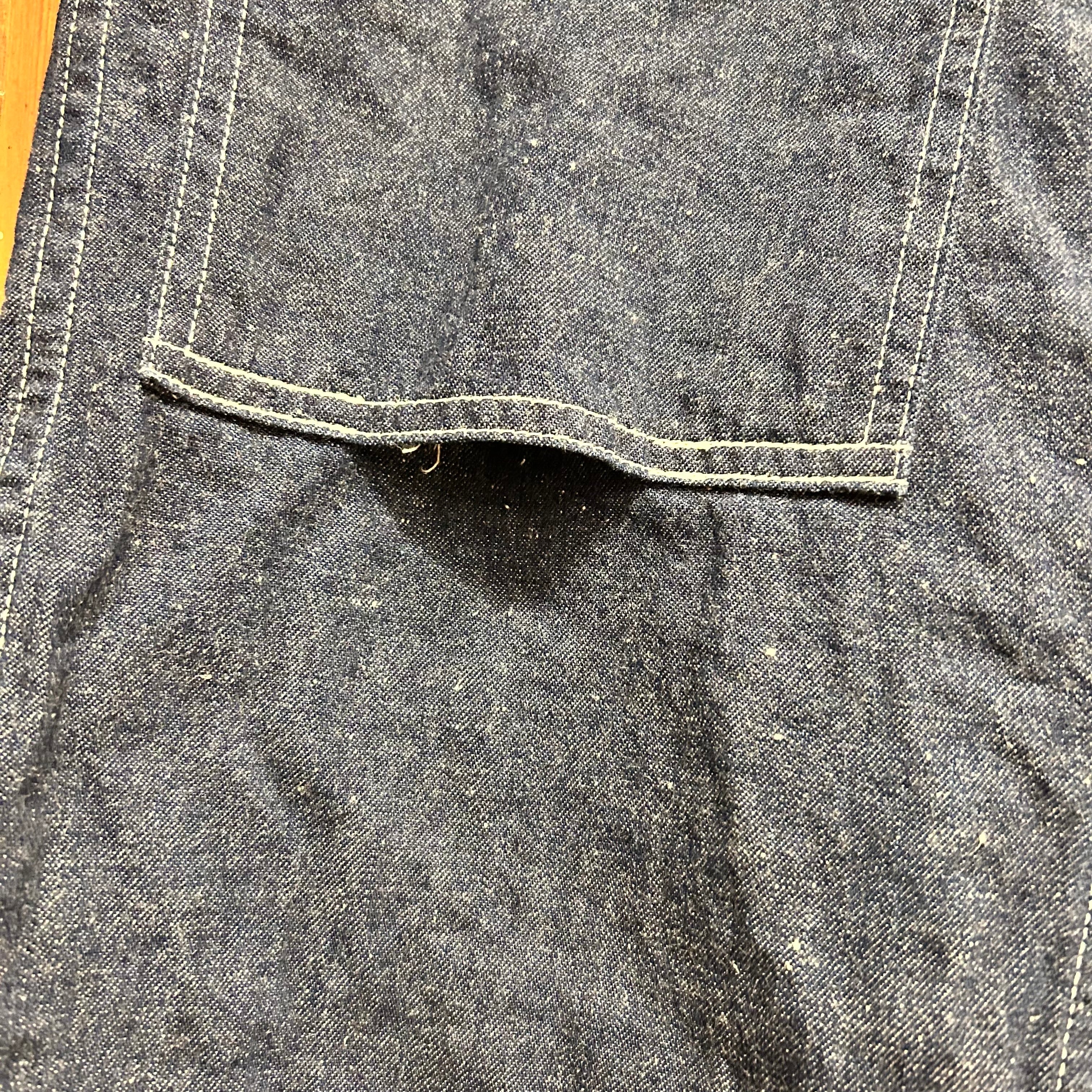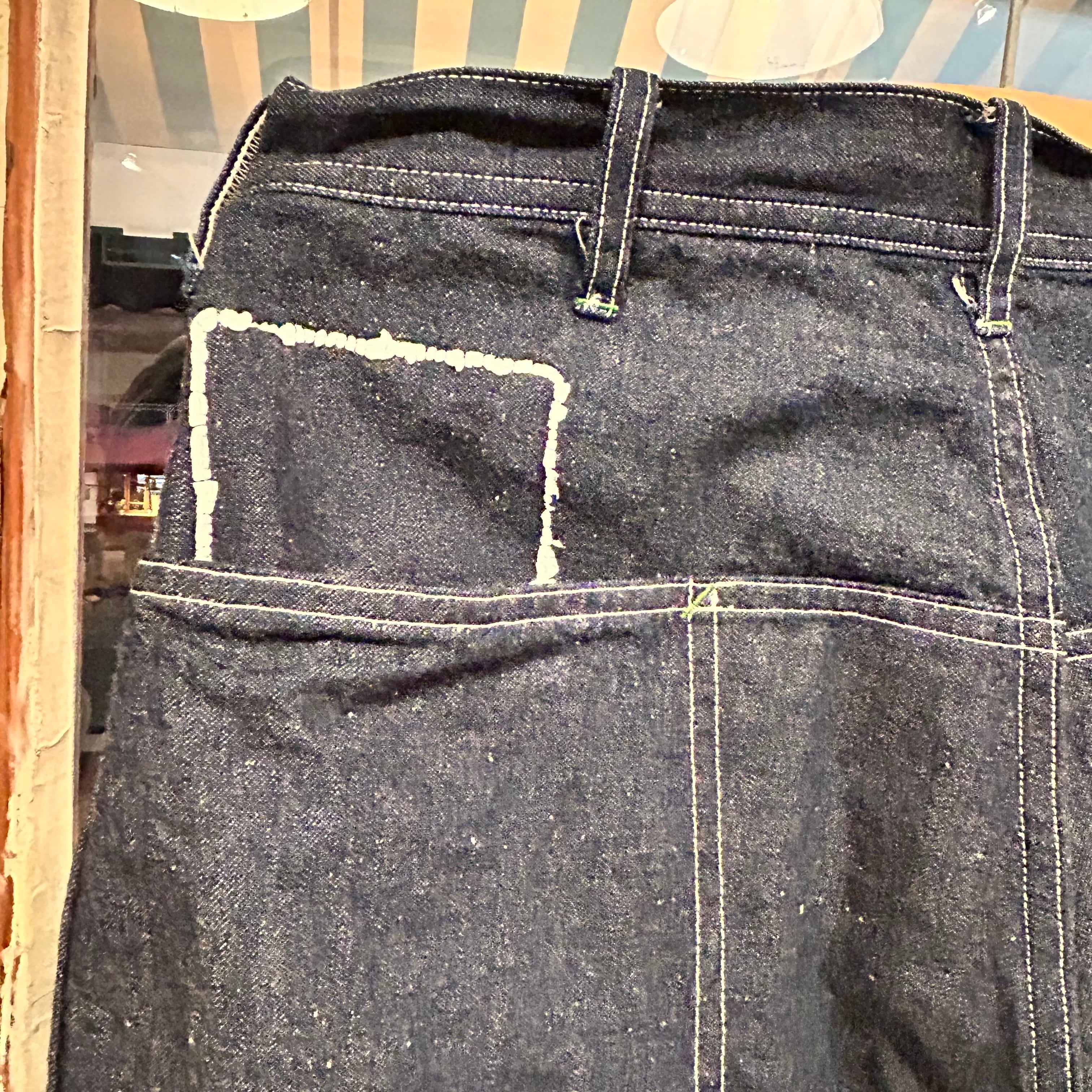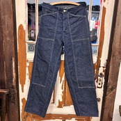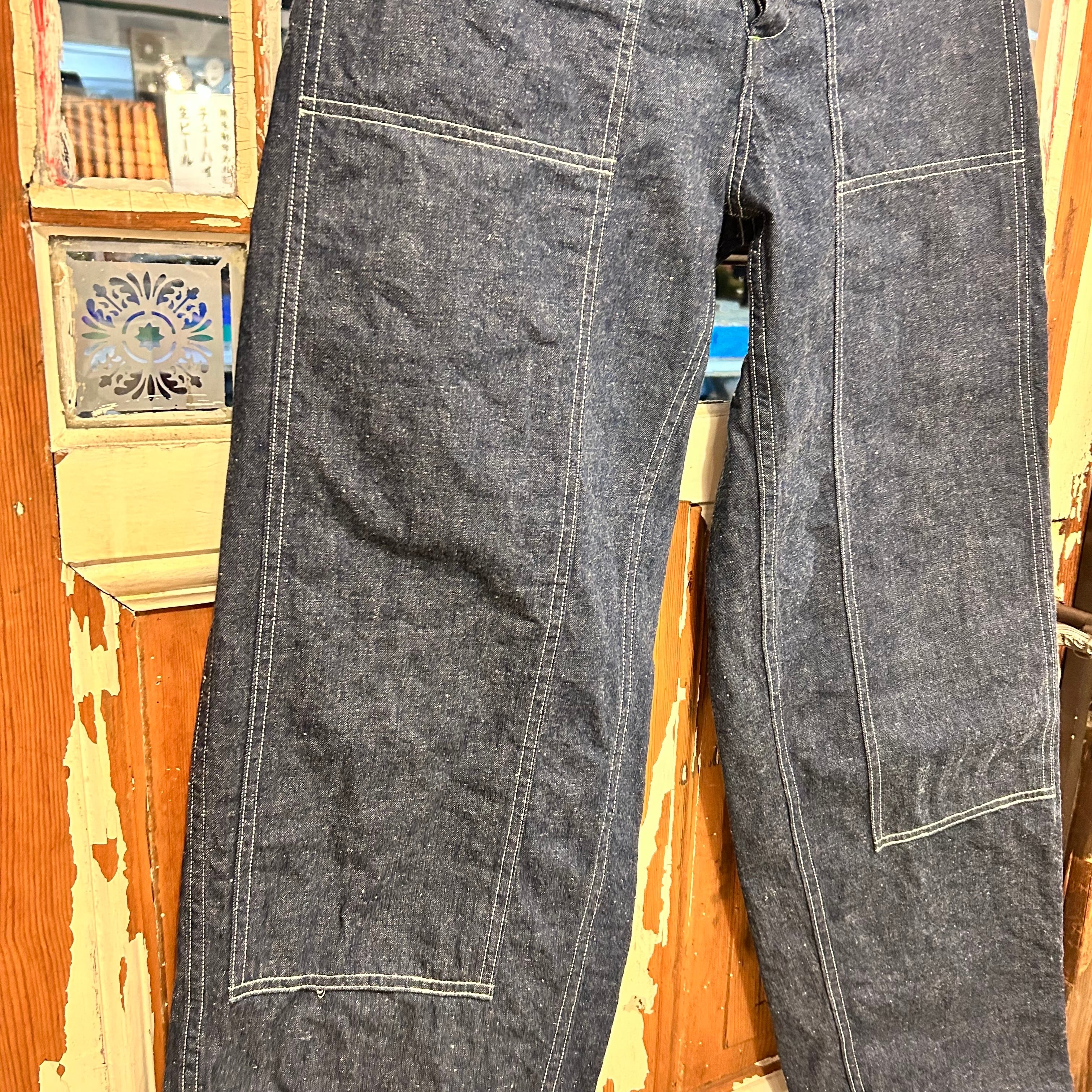 1930年代後期から1940年代初頭の一時期に実在した滅多にお目にかかれないL社の4シリーズのペインターパンツをベースにして3シリーズの特徴でもあるダブルステッチ縫製にてDURA-BILTの解釈として作り上げたペインターパンツとなります。フロントはダブルニー、ヒップは一見構造が理解しづらいダブルヒップの二重構造仕様が特徴となります。3シリーズ初期の特徴でもある角形ポケット、そして初期型のみに備わる緑カンヌキ、16.8ミリのUNION MADEボタン。当時物と同じ鉄製ツープロング仕様で3シリーズとして実在していてもおかしくないインスパイアモデルとしてDURA-BILTネームで仕上げています。