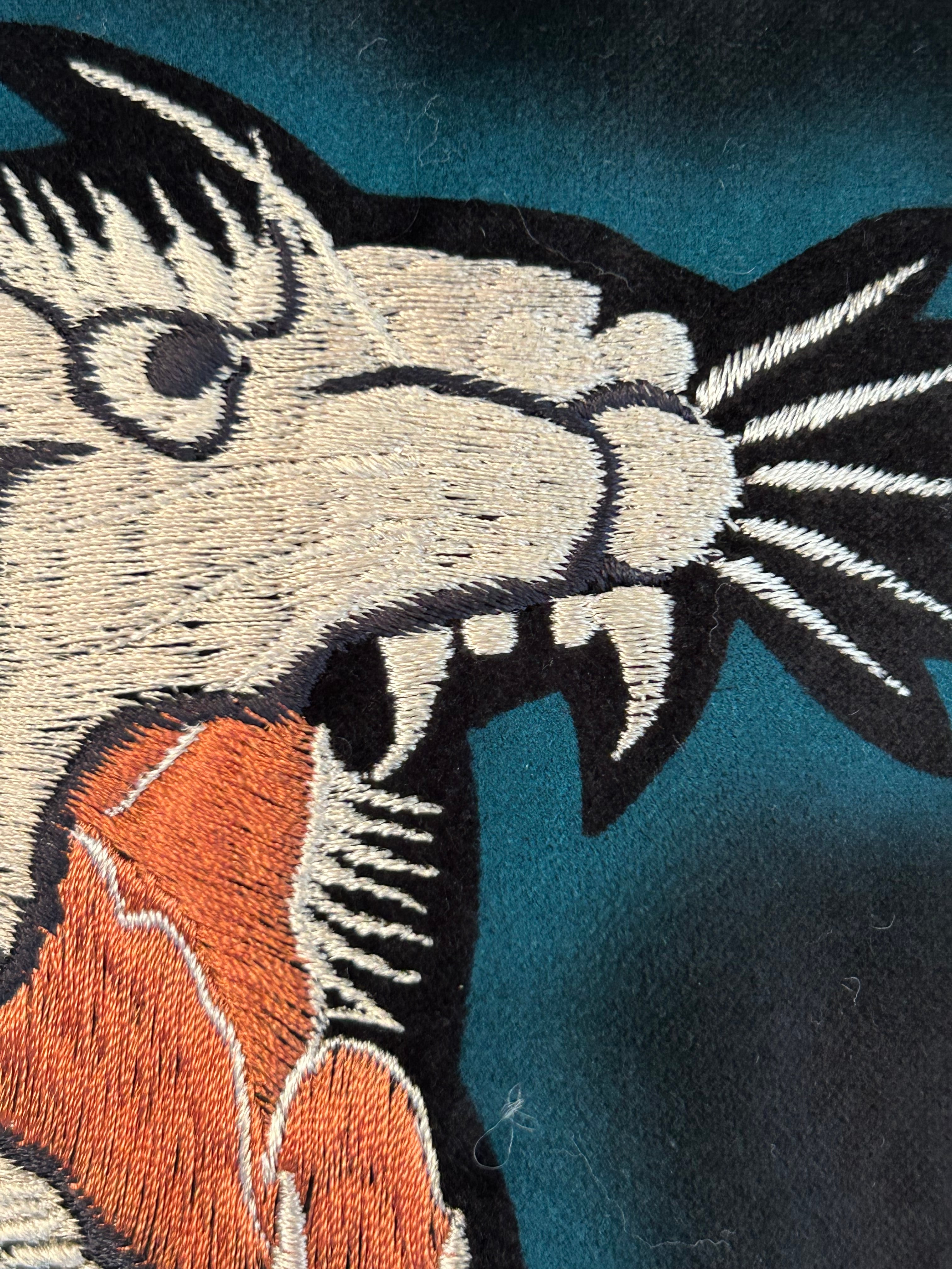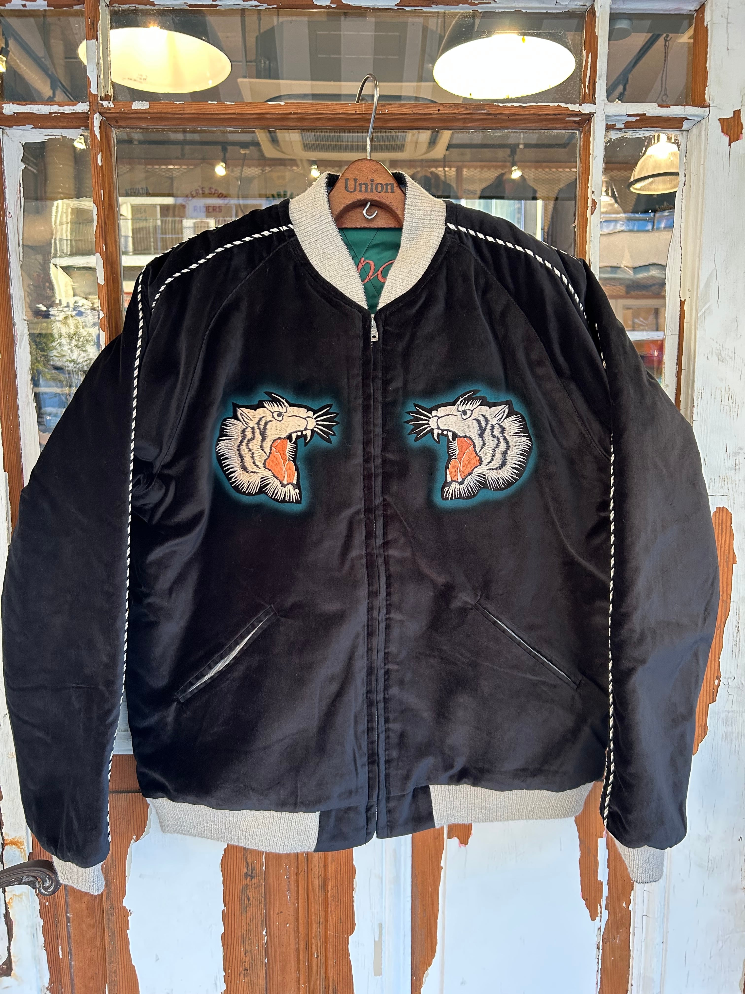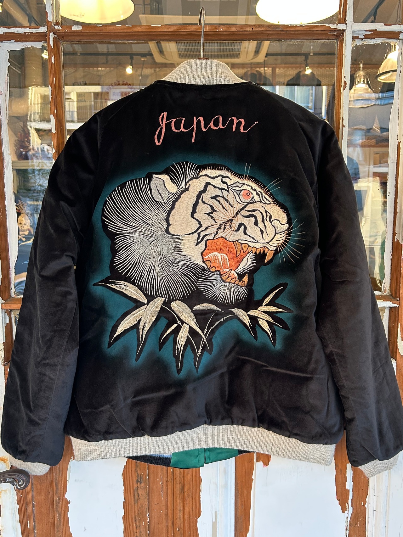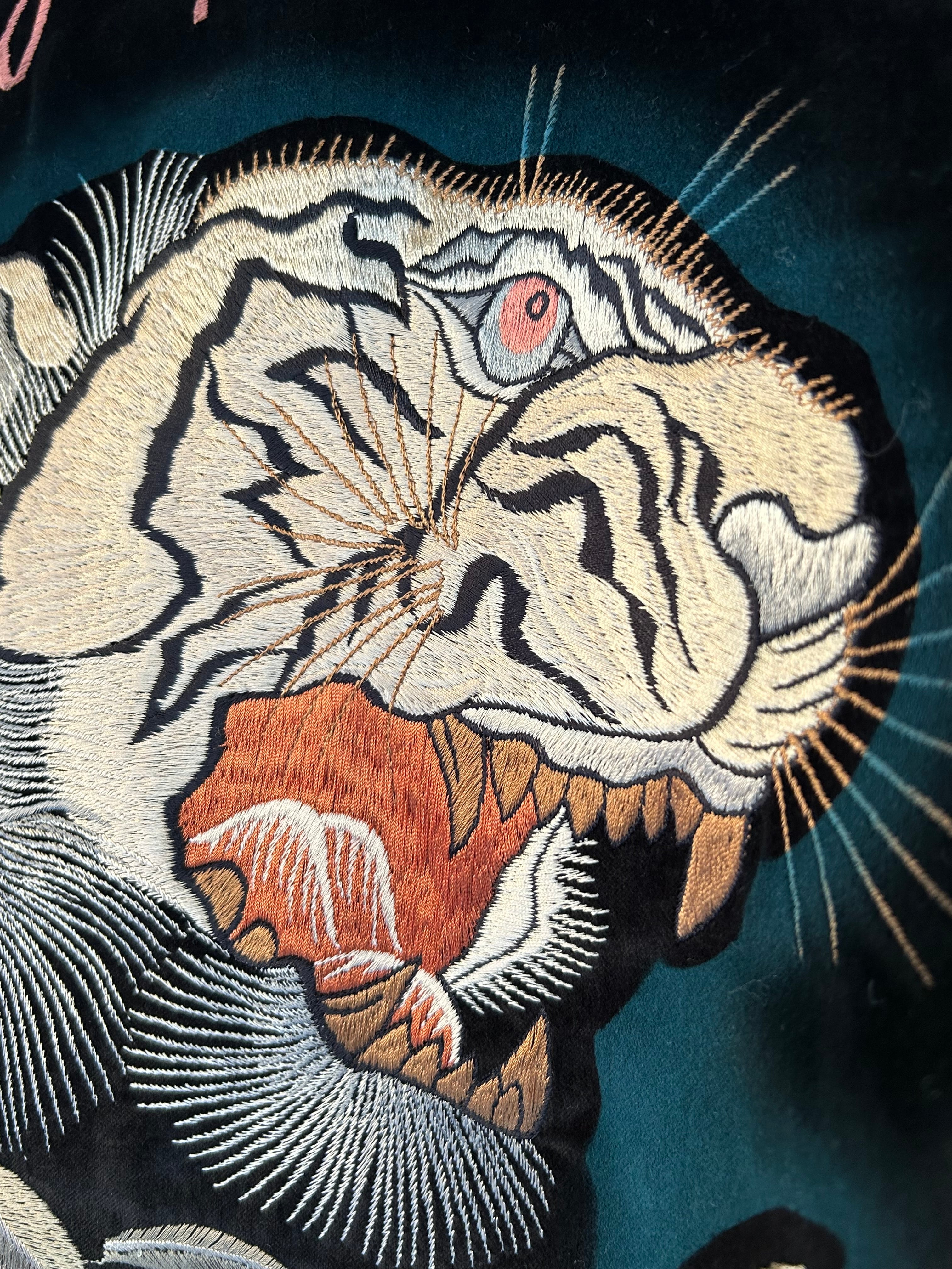 東洋エンタープライズの60周年を記念し、ヴィンテージではウルトラレアとされるステンシルが施されたスーベニアジャケットを復刻。当時、スカジャンと同様に横降り刺繍が施されたクッションカバーも米兵の土産物として好まれ、そのバリエーションとして刺繍とステンシルを組み合わせたものが存在する。しかし、ジャケットとして仕立てられたものは極めて珍しく、まさしくスペシャルな一着。刺繍は1950年代中期の「タイガーヘッド」と呼ばれる絵柄で、白虎の顔の周りにはブルーのステンシルが噴かれ、黒い別珍から浮き出てくるかのような迫力。うねる鬣は何度も針足を変えながら一本一本丁寧に描かれ、血走った瞳は赤い刺繍糸で強調されている。