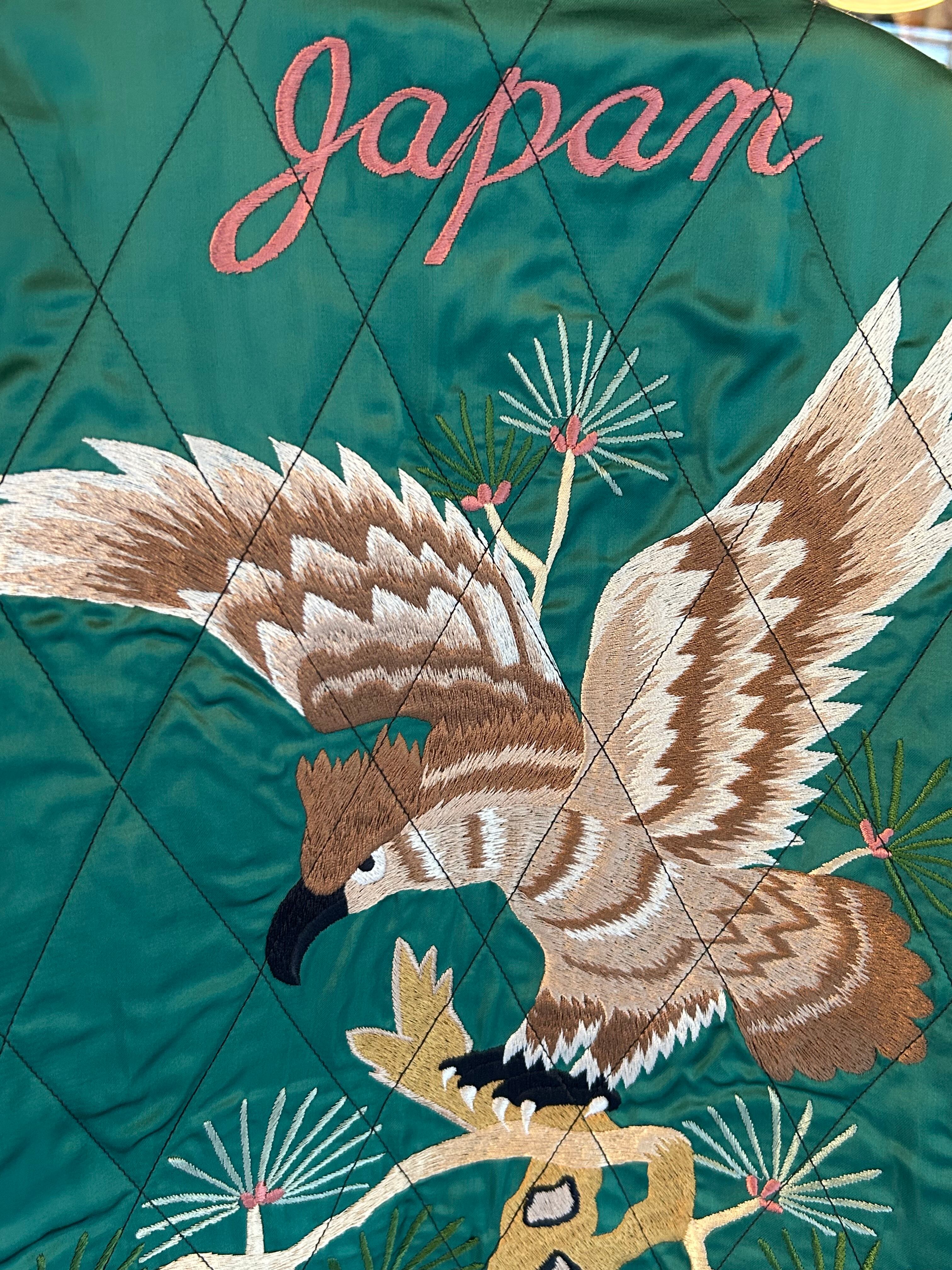 リバーシブル面は、見頃よりも袖下の色が濃い「逆配色」。鮮やかなグリーンボディに描かれるのは、翼を広げた鷲、そして立派な枝ぶりの松の木。盆栽などにも通じる、力強い樹形を鑑賞して愛でる日本の美が表現されている。当時も今も、職人の卓越した技術がなければ生み出せない圧巻の作品。