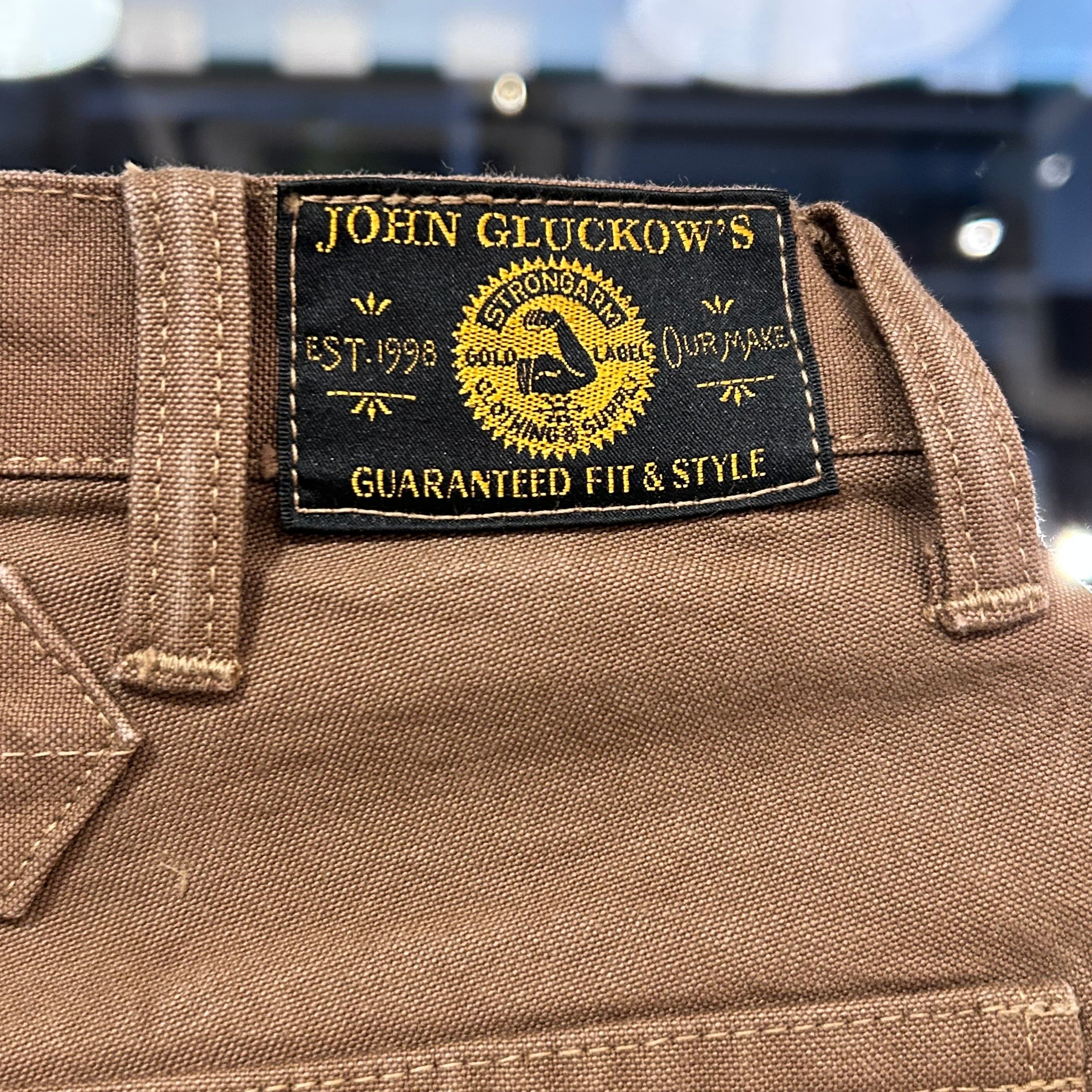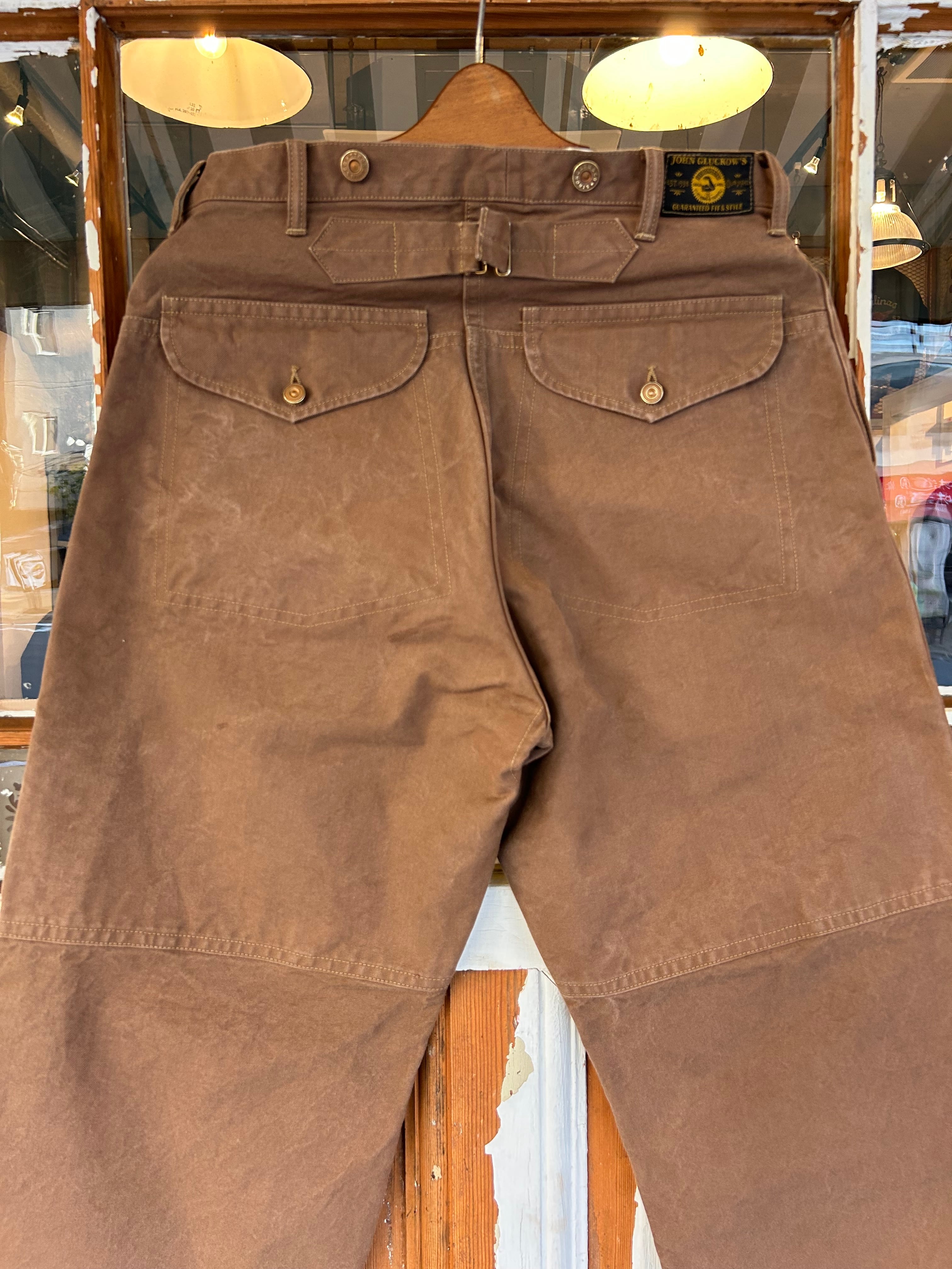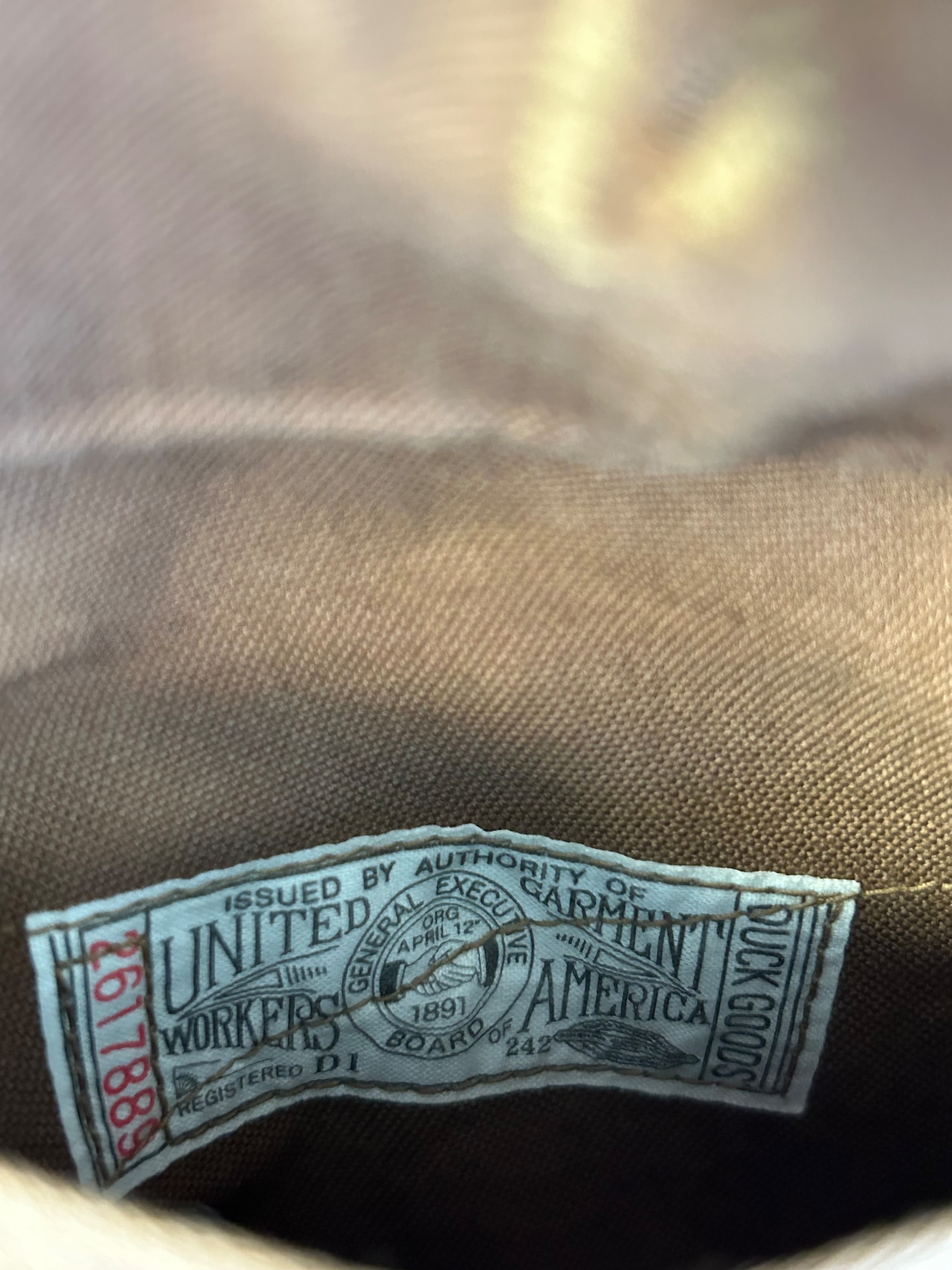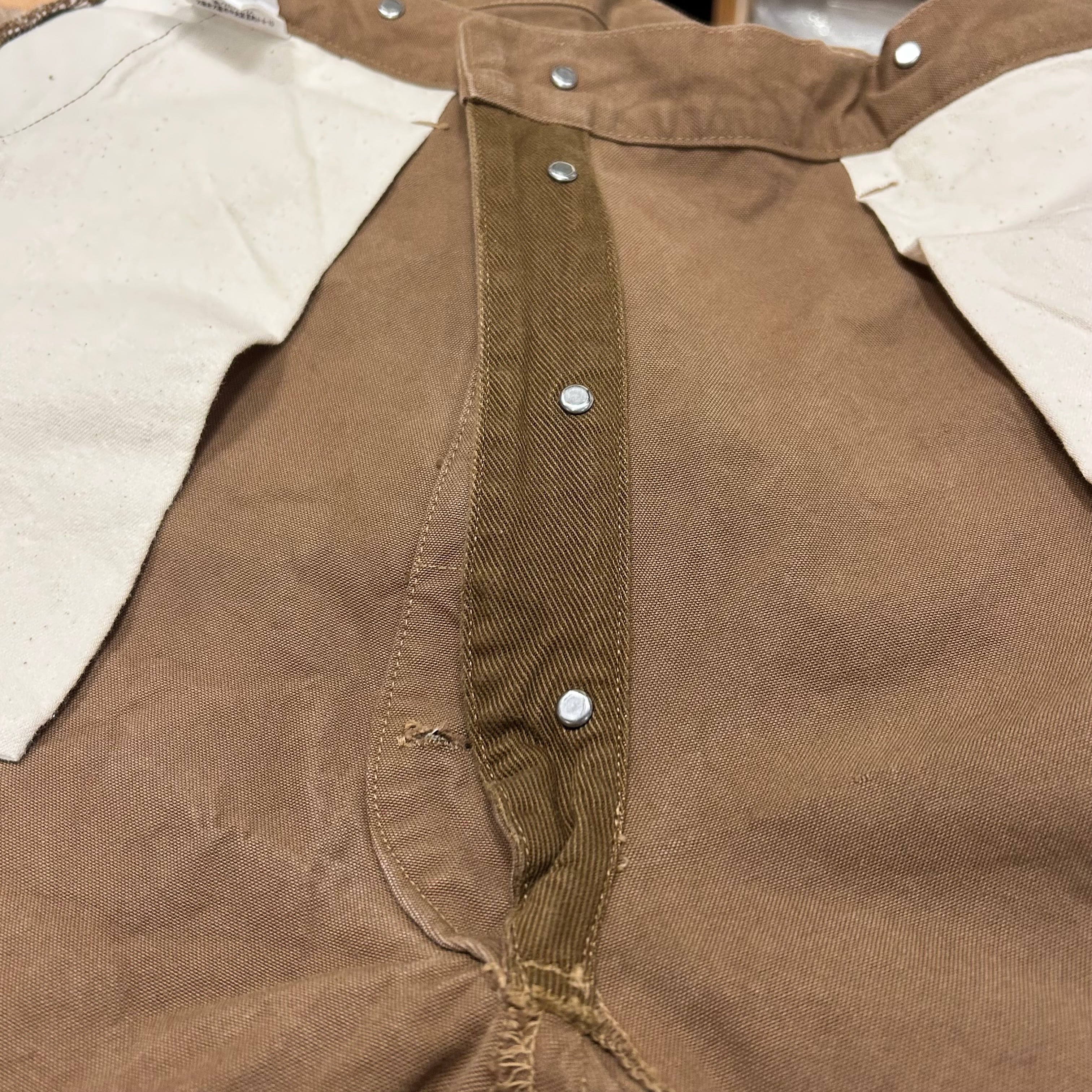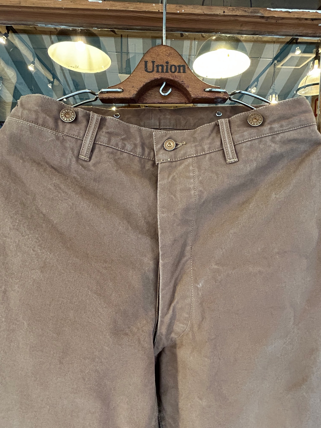 太番手のスレン先染め糸を高密度に織り上げたセルヴィッチキャンバスを使っており、フロント全面はヒップ下まで二枚仕立てになっていて、かなりヘビーデューティーなパンツになります。そして、ボタンにはブルズアイ、ボタンフライ裏には別布で補強、針刺しのシンチバック、サスペンダーボタン等、マニア受けするディティールが満載です。
