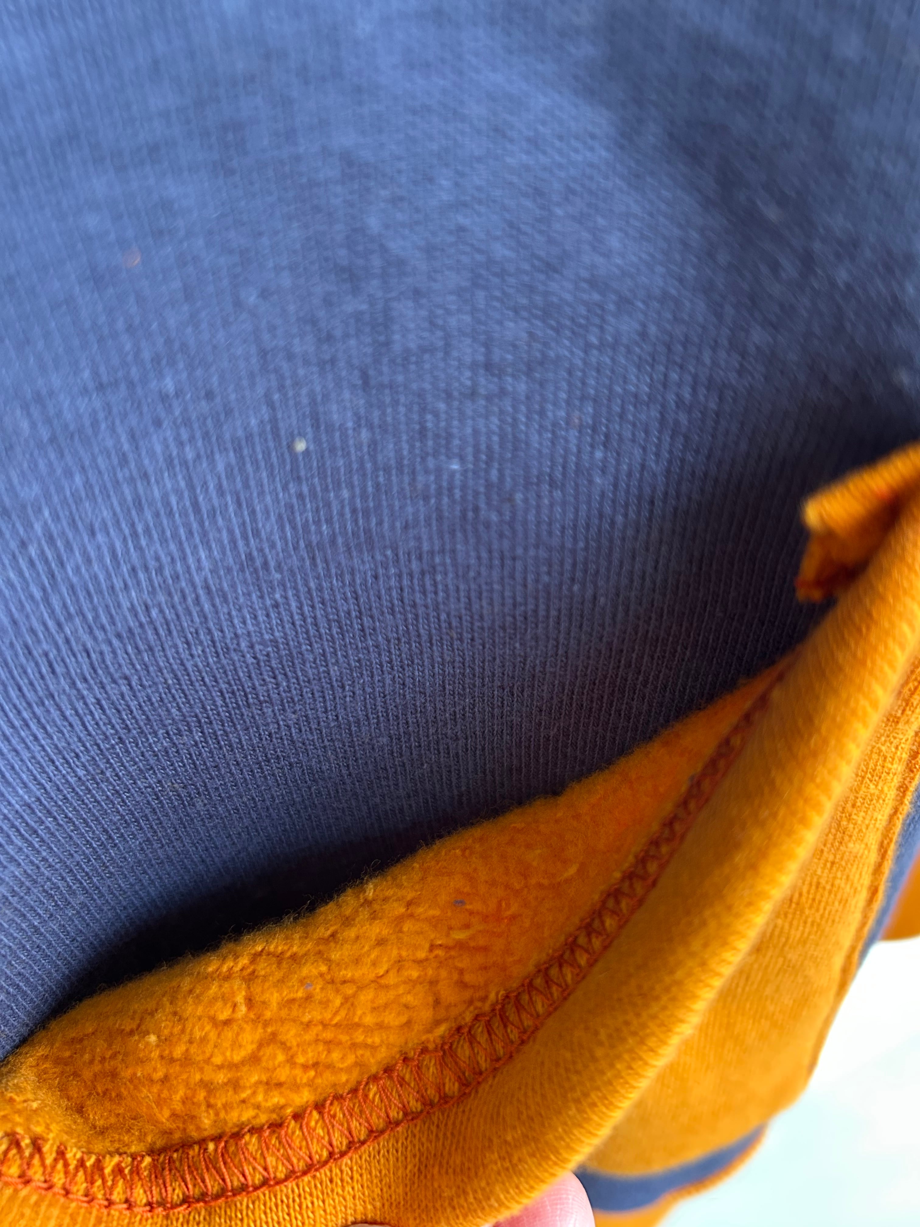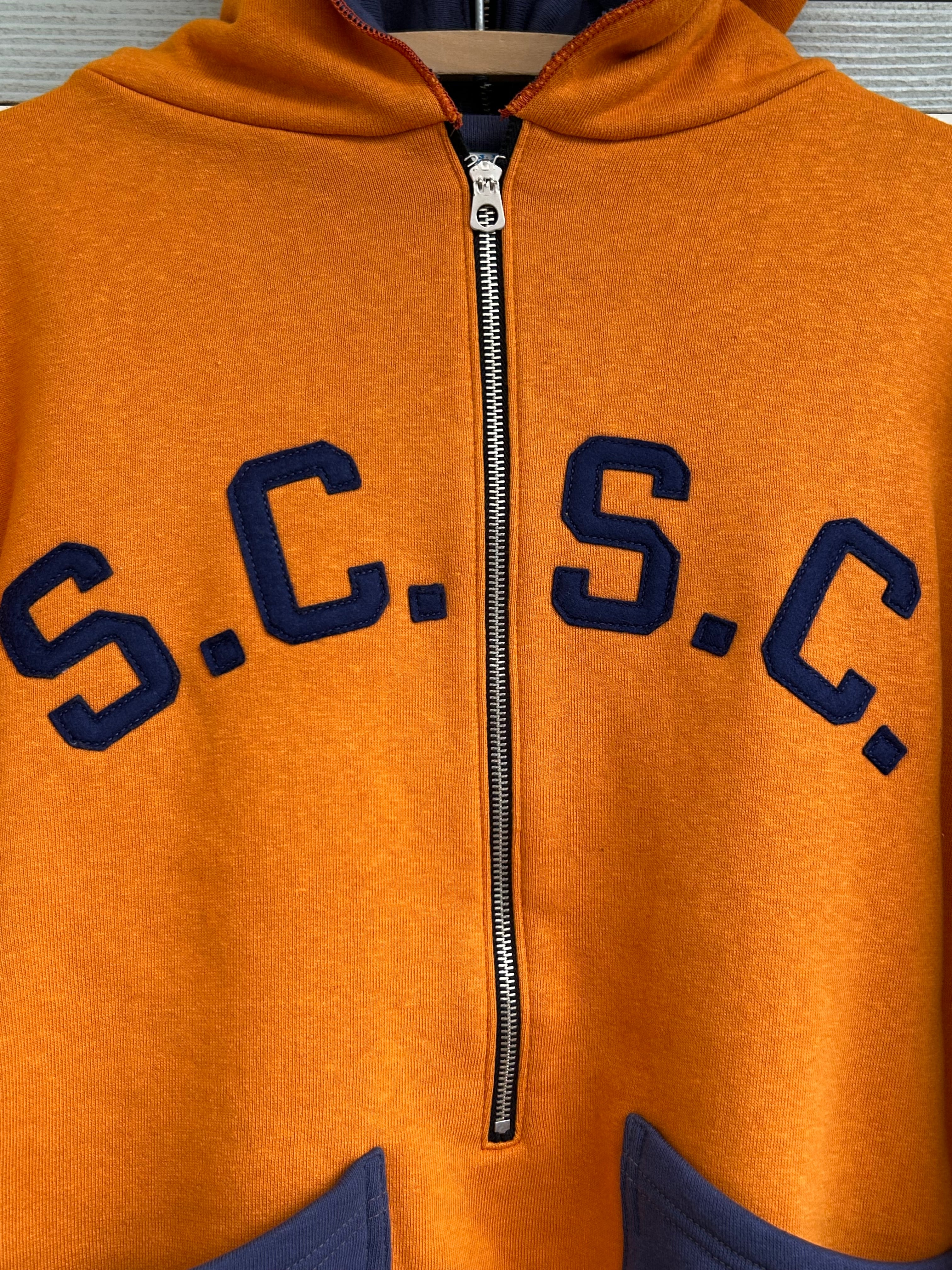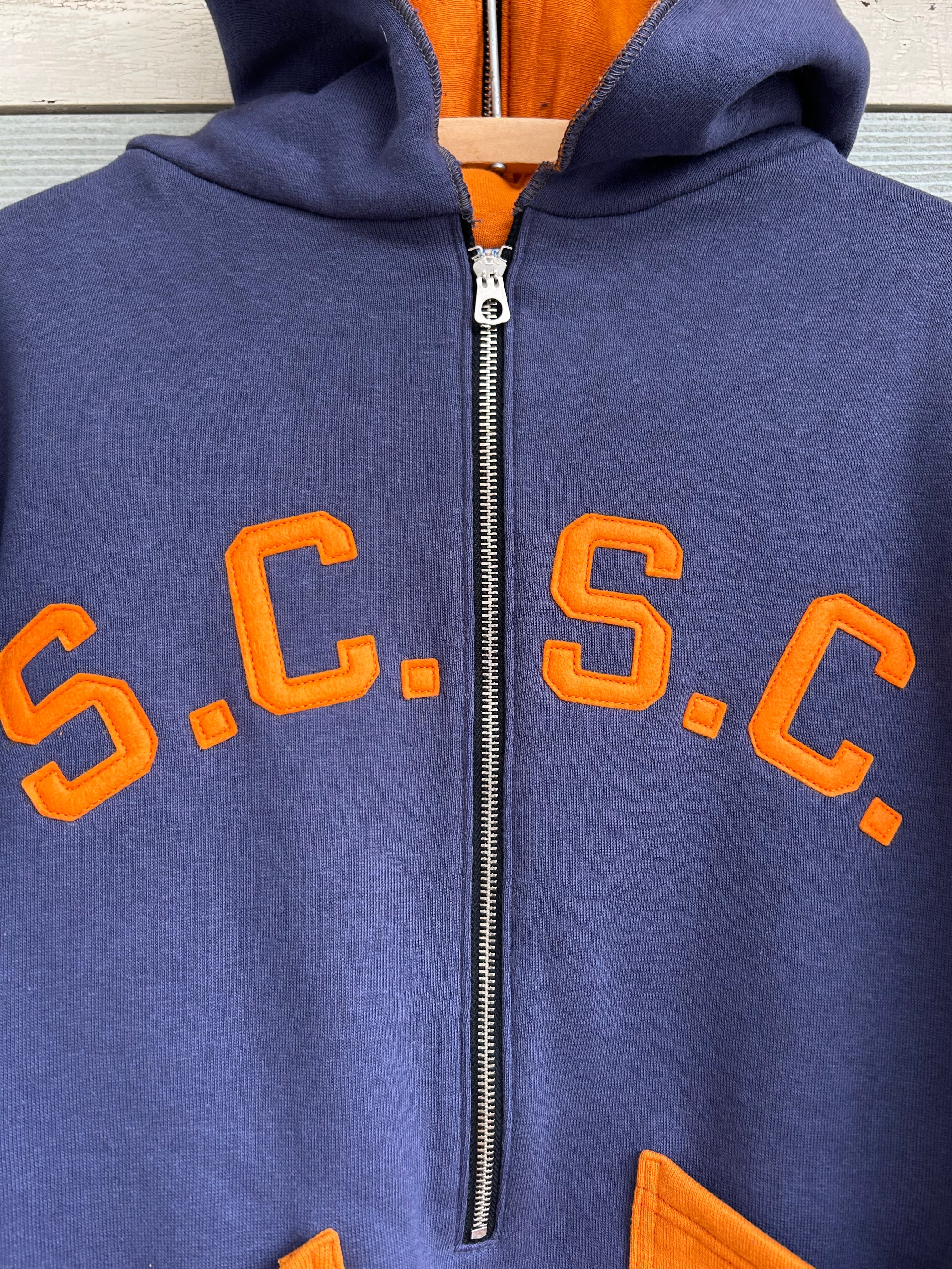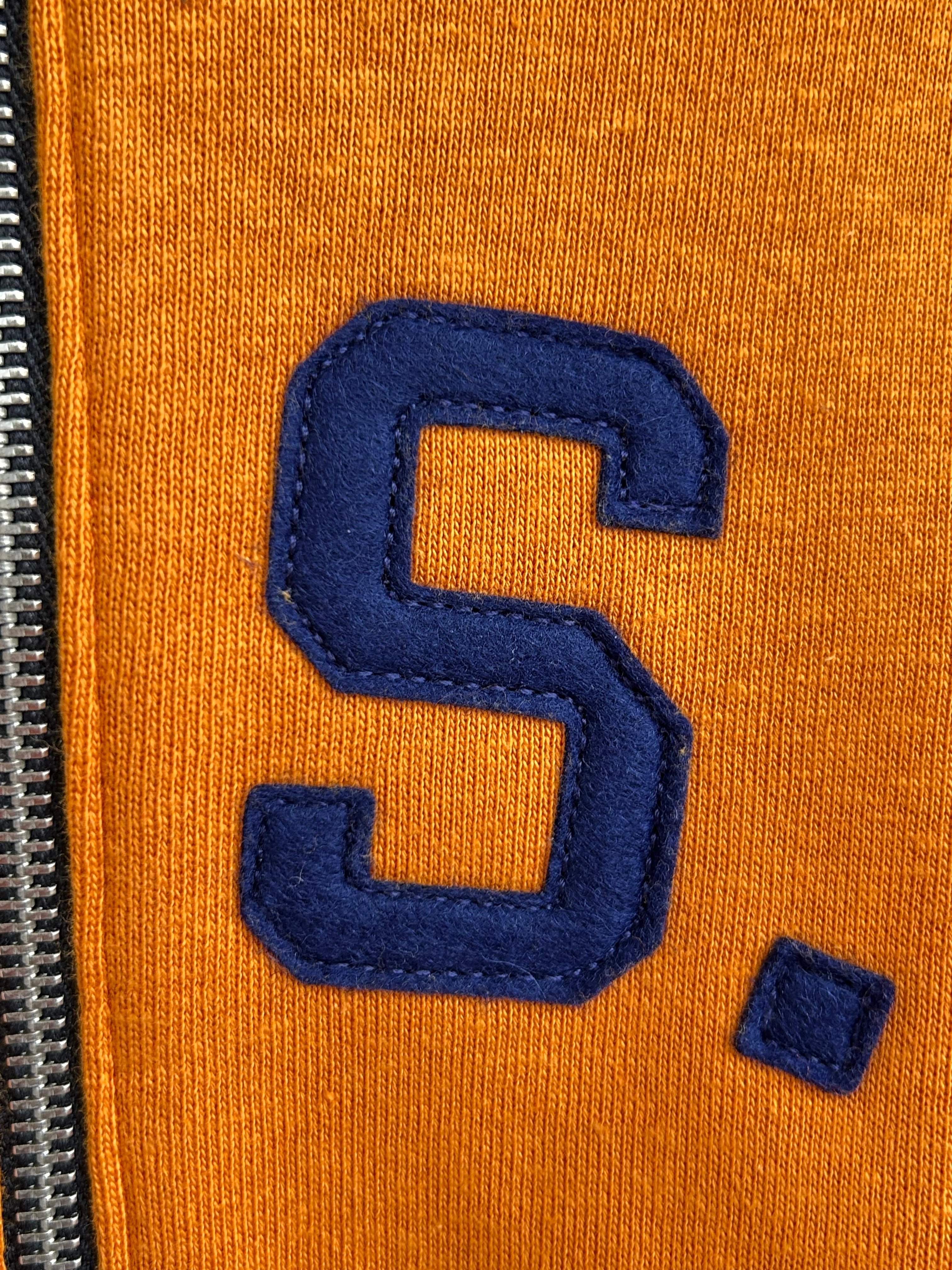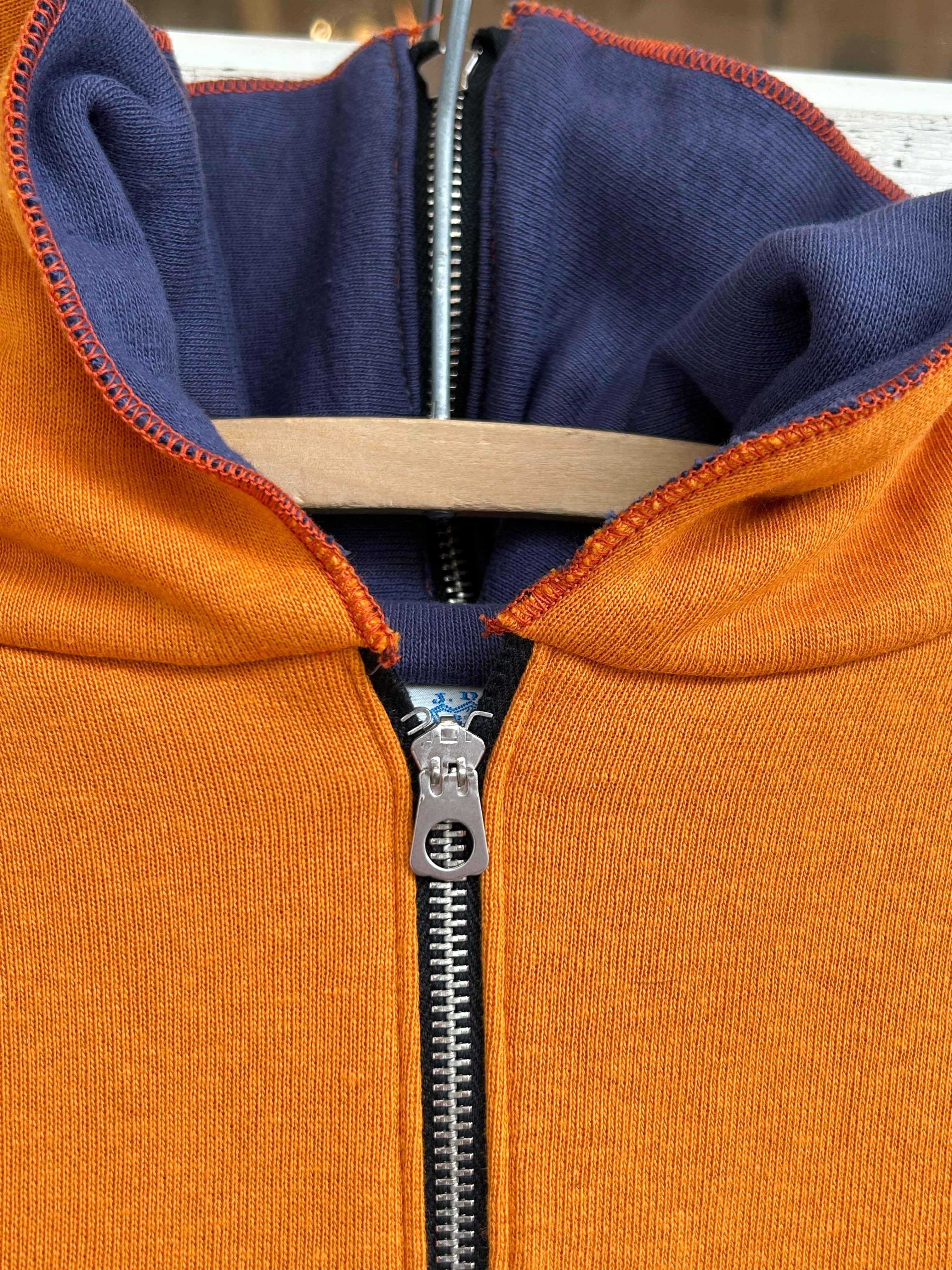 オリンピック・チャンピオンは、ヴィンテージ市場で最も古くから知られているチャンピオンのスウェットシャツがベースになっています。このレーベルは他ではほとんど知られていません。そして、デザインは本当にユニークで、ロングジッパーのフロントプルオーバー、フード、低めのパッチポケットを備えています。このネイビー/オレンジのツートーンも、スウェットの世界ではかなりレアなカラーリングです。フェルトレタリングも着て洗濯を繰り返すと縫製糸が縮みより深い味わいを増します。