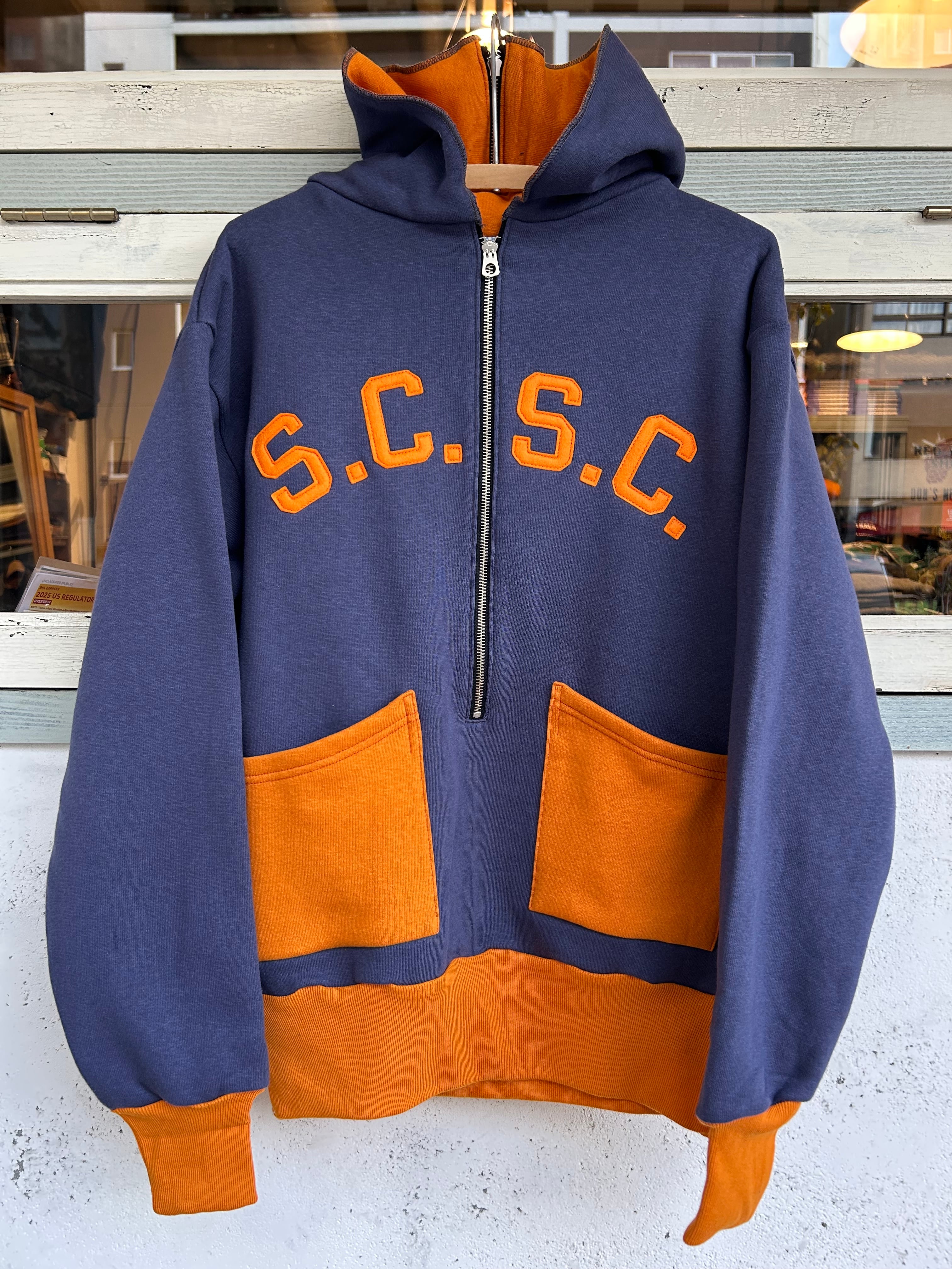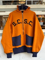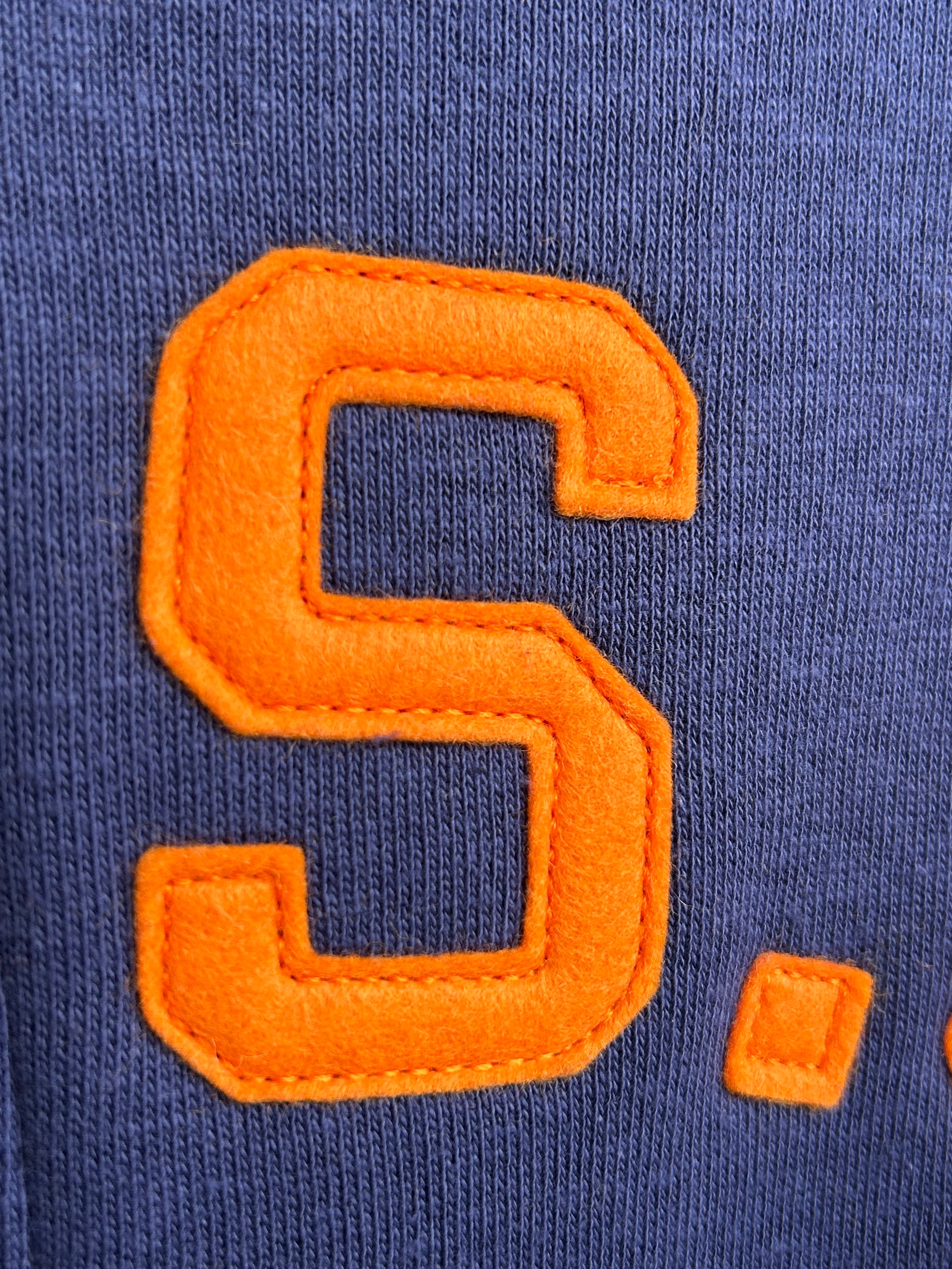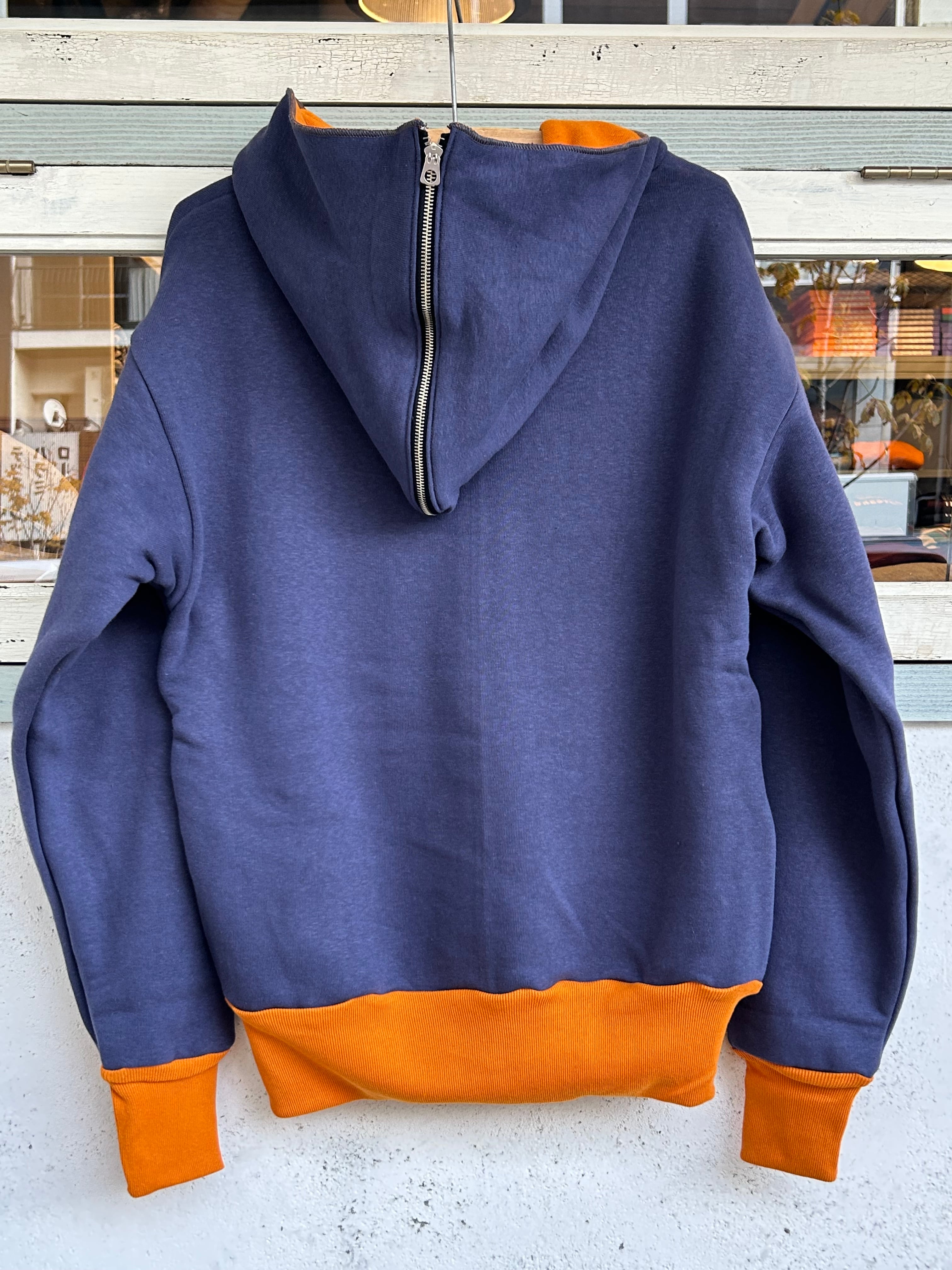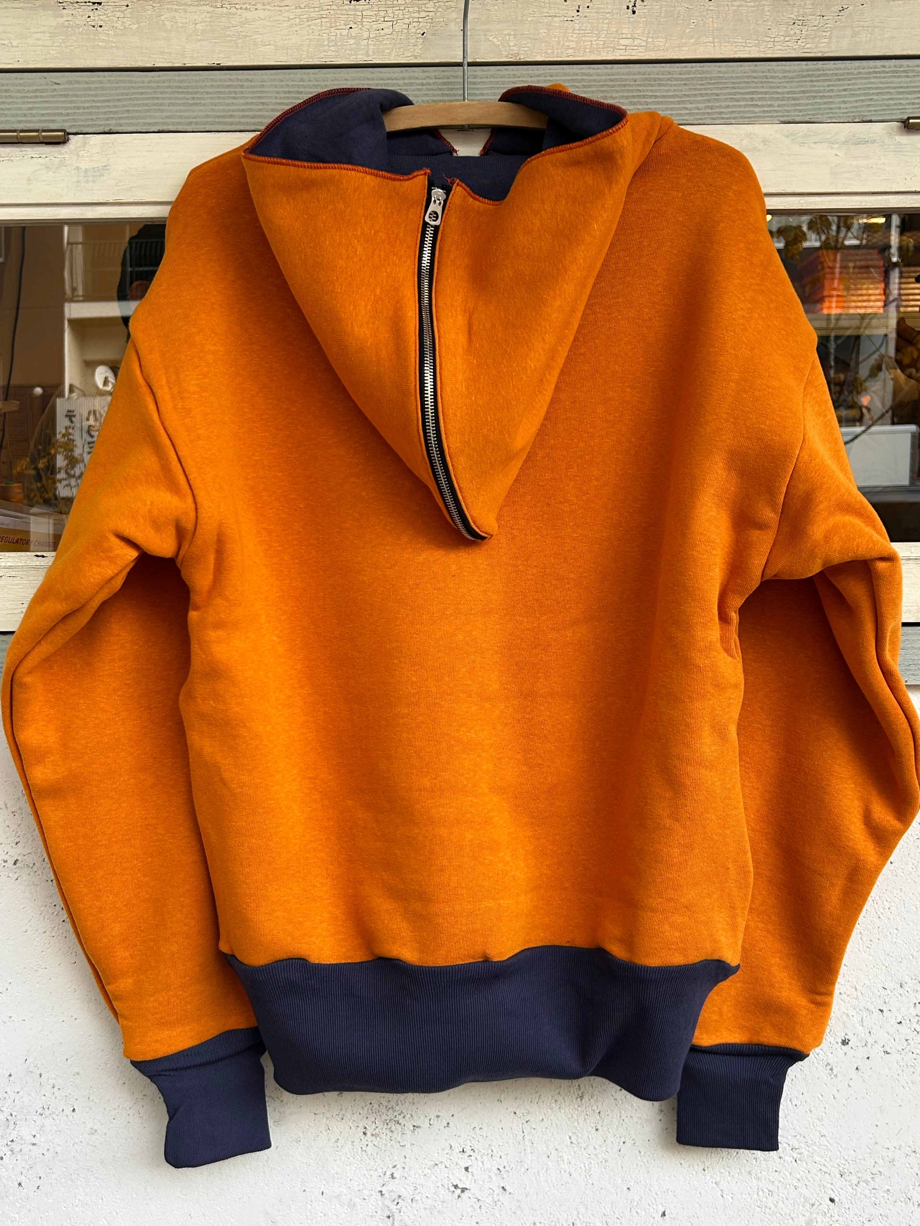 オリンピック・チャンピオンは、ヴィンテージ市場で最も古くから知られているチャンピオンのスウェットシャツがベースになっています。このレーベルは他ではほとんど知られていません。そして、デザインは本当にユニークで、ロングジッパーのフロントプルオーバー、フード、低めのパッチポケットを備えています。このネイビー/オレンジのツートーンも、スウェットの世界ではかなりレアなカラーリングです。フェルトレタリングも着て洗濯を繰り返すと縫製糸が縮みより深い味わいを増します。