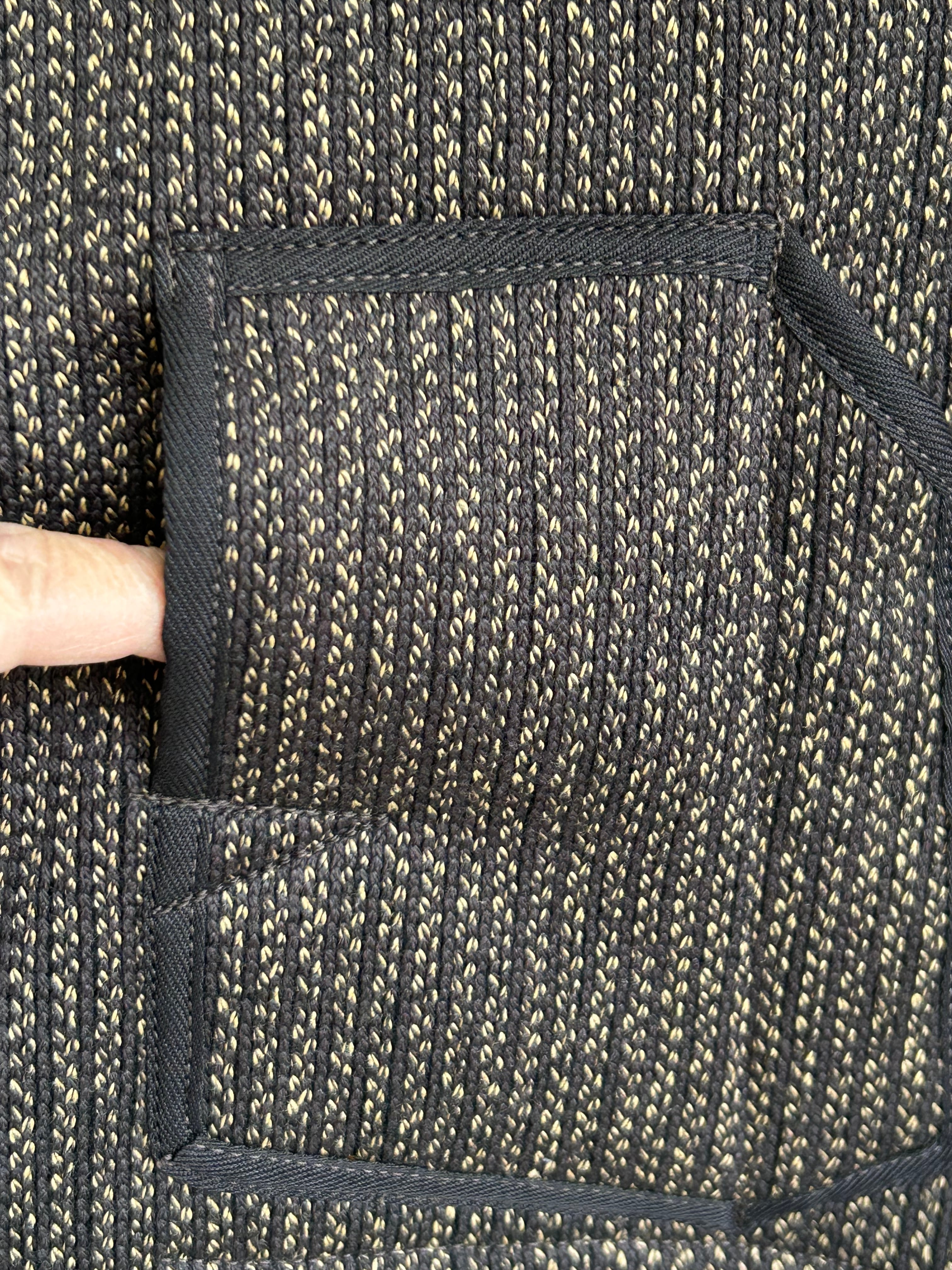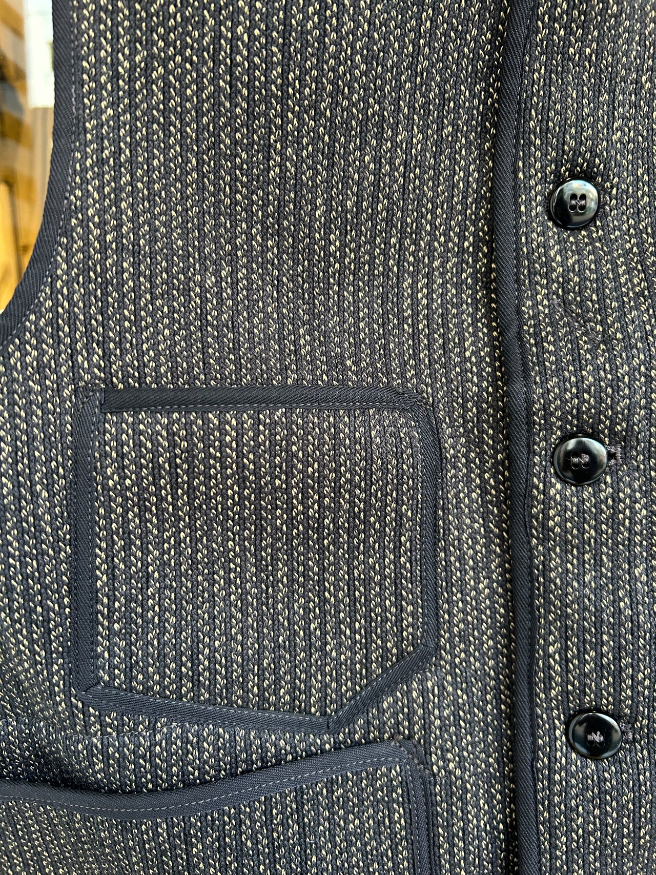 胸のポケットは左右非対称でジャケット同様にやや低めに位置しています。腰ポケットは角形のやや大きめものがついています。