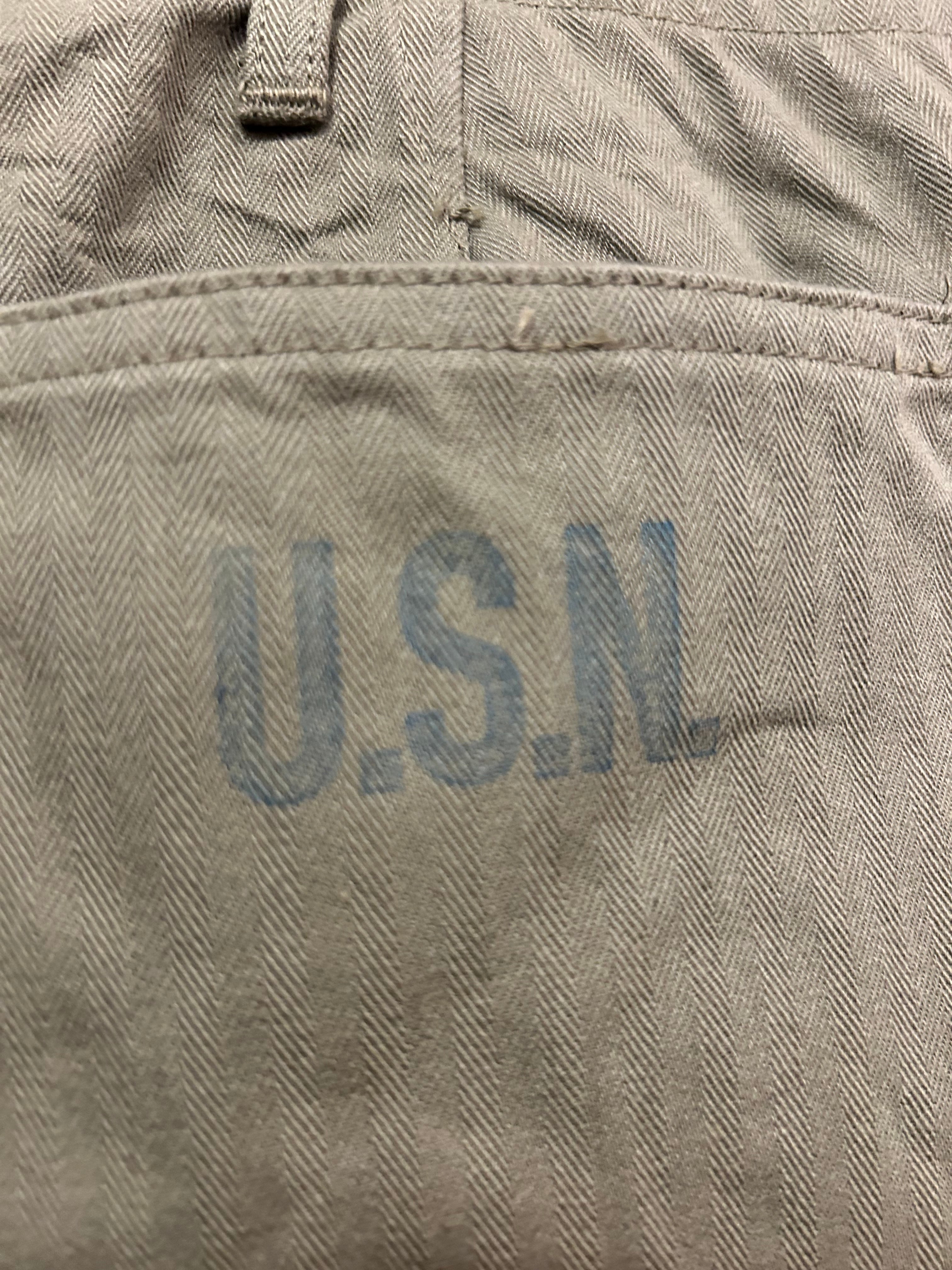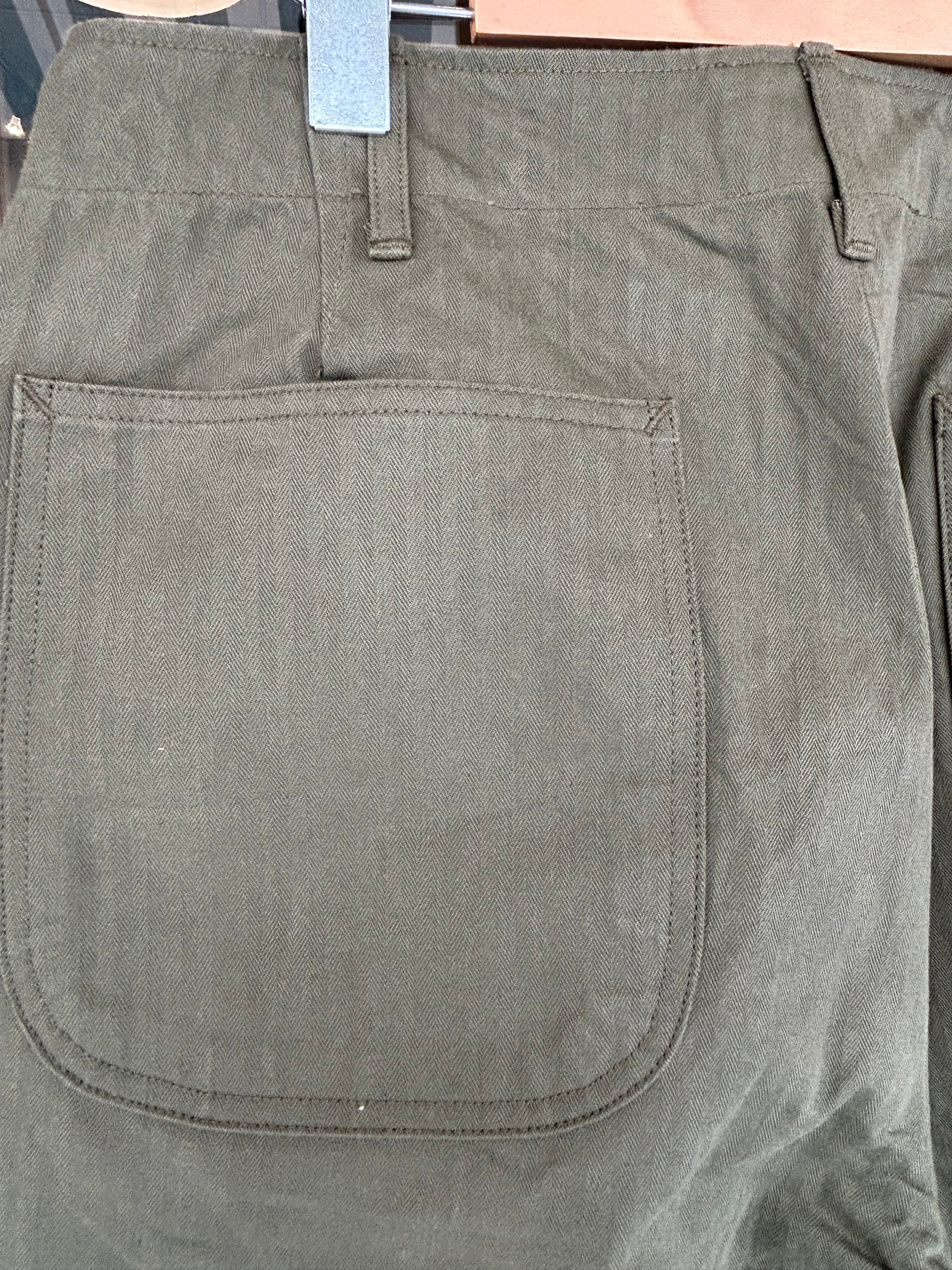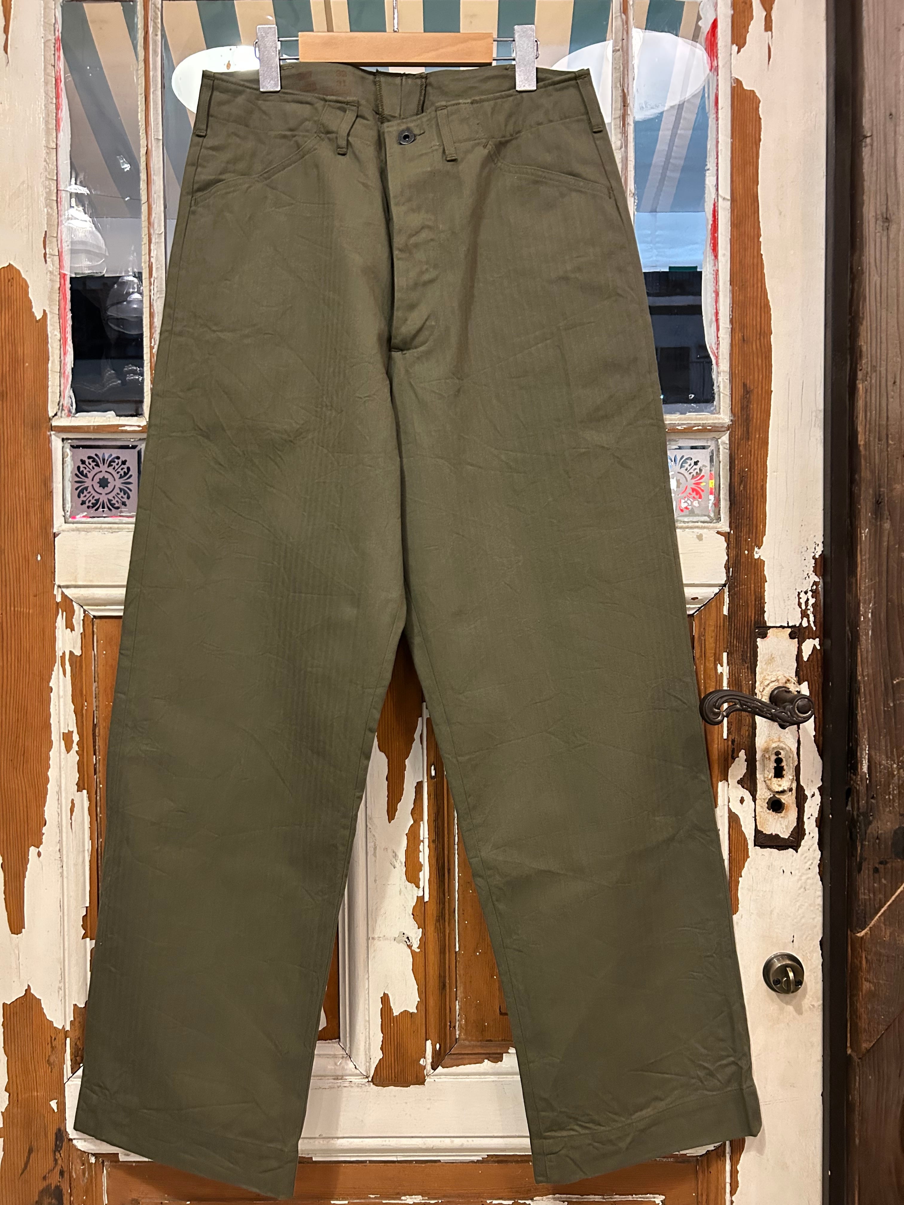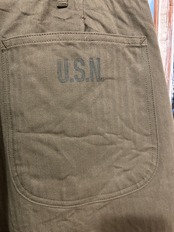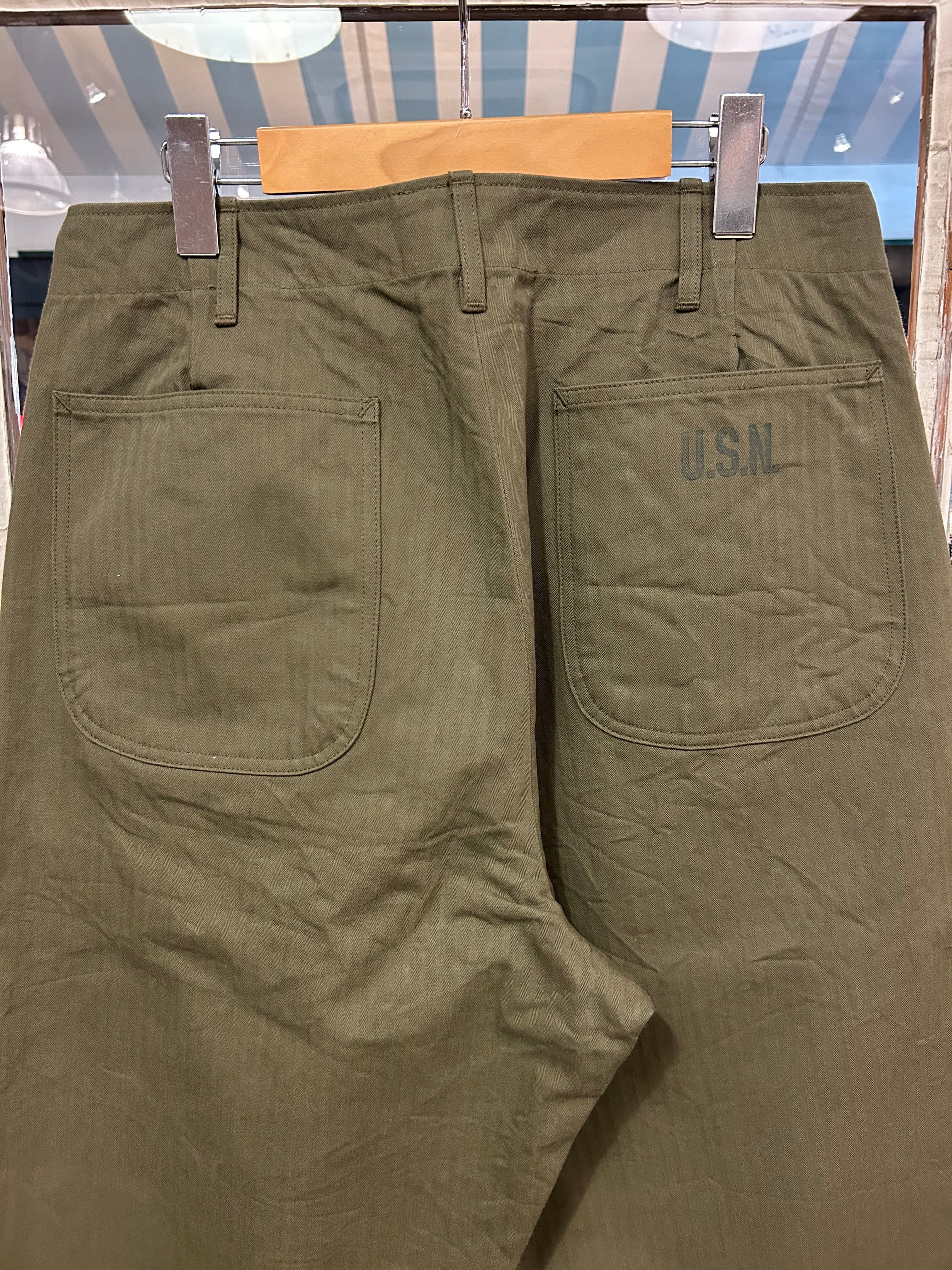 米海軍が1940年代初頭に採用したN-3ユーティリティパンツ。シンプルにヒップポケットが2つついた仕様は同時期に米海兵隊が採用したパンツM-41と同じ外観を持ち、ヒップポケットにマーキングされた『USN』でN-3ユーティリティーパンツと判別する。ボタンは大戦期に使用された黒塗りのドーナツ型タックボタンで月桂樹の刻印が施されている。第二次大戦が勃発し兵士が増員されると装備品の追加生産が急がれ、このN-3のように1つの素材で裏素材からポケット地までを形成したパンツで対応し、量産性に備えた。(BUZZ RICKSON’Sカタログより)