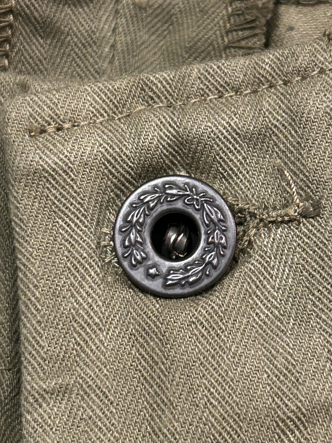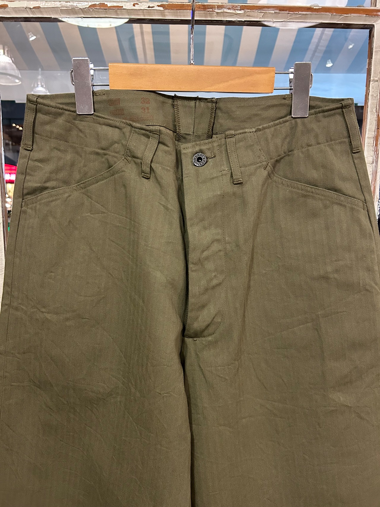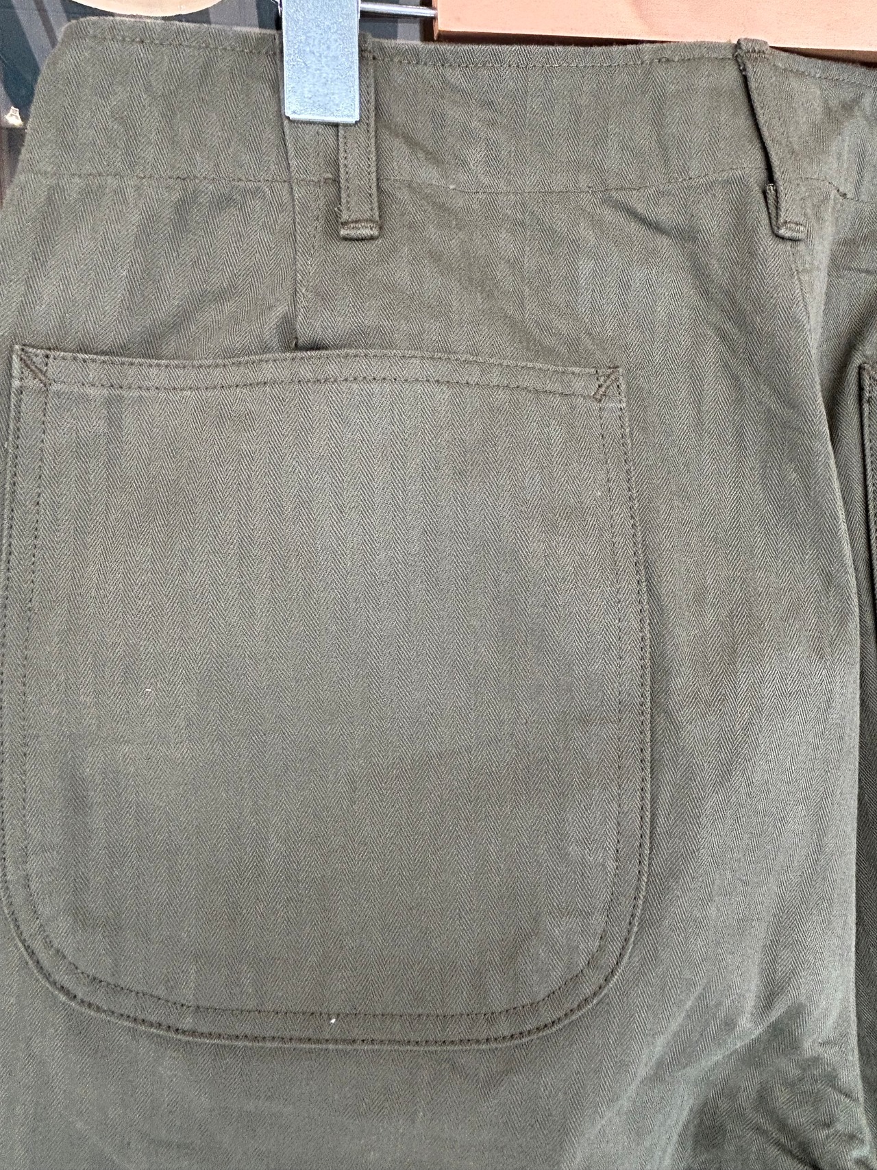 米海軍が1940年代初頭に採用したN-3ユーティリティパンツ。シンプルにヒップポケットが2つついた仕様は同時期に米海兵隊が採用したパンツM-41と同じ外観を持ち、ヒップポケットにマーキングされた『USN』でN-3ユーティリティーパンツと判別する。ボタンは大戦期に使用された黒塗りのドーナツ型タックボタンで月桂樹の刻印が施されている。第二次大戦が勃発し兵士が増員されると装備品の追加生産が急がれ、このN-3のように1つの素材で裏素材からポケット地までを形成したパンツで対応し、量産性に備えた。(BUZZ RICKSON’Sカタログより)