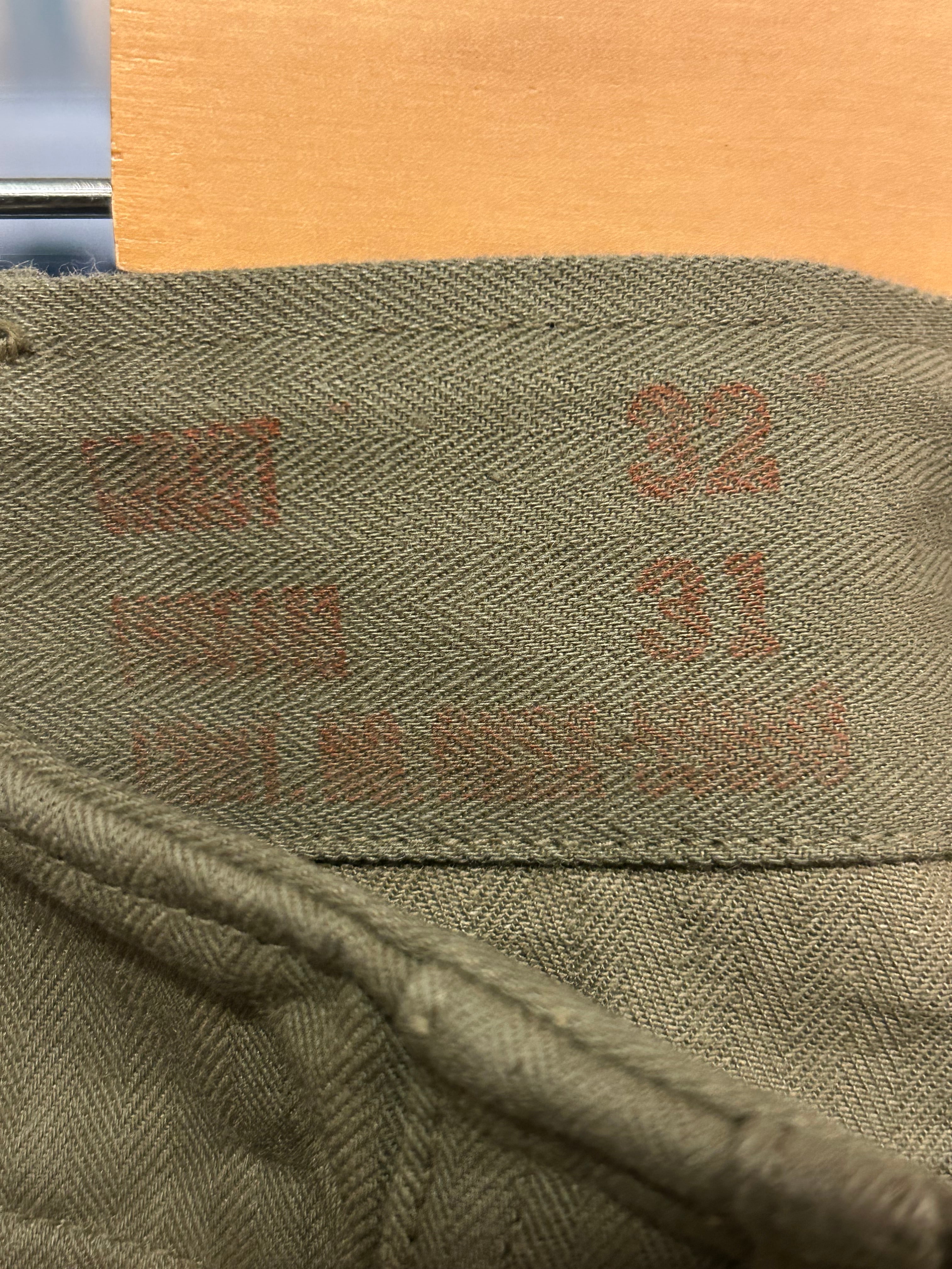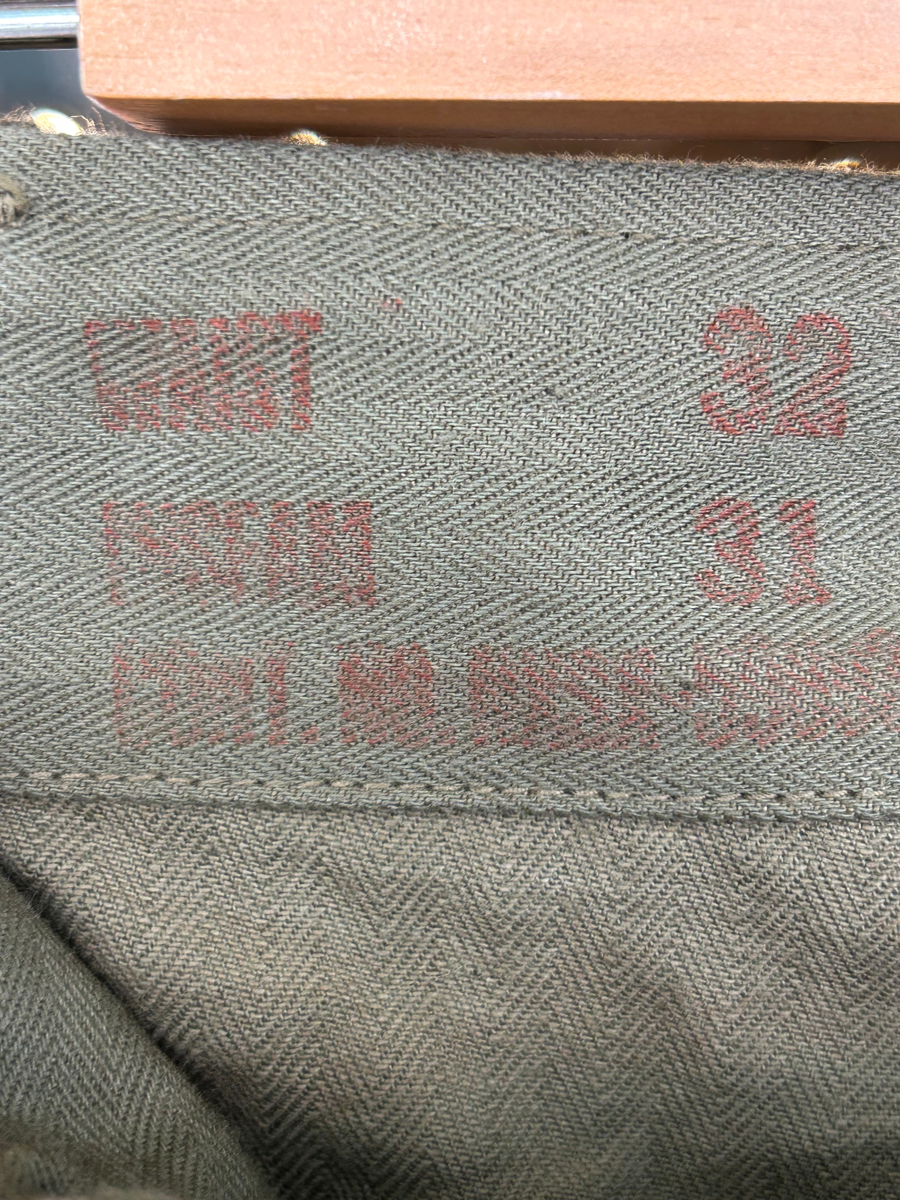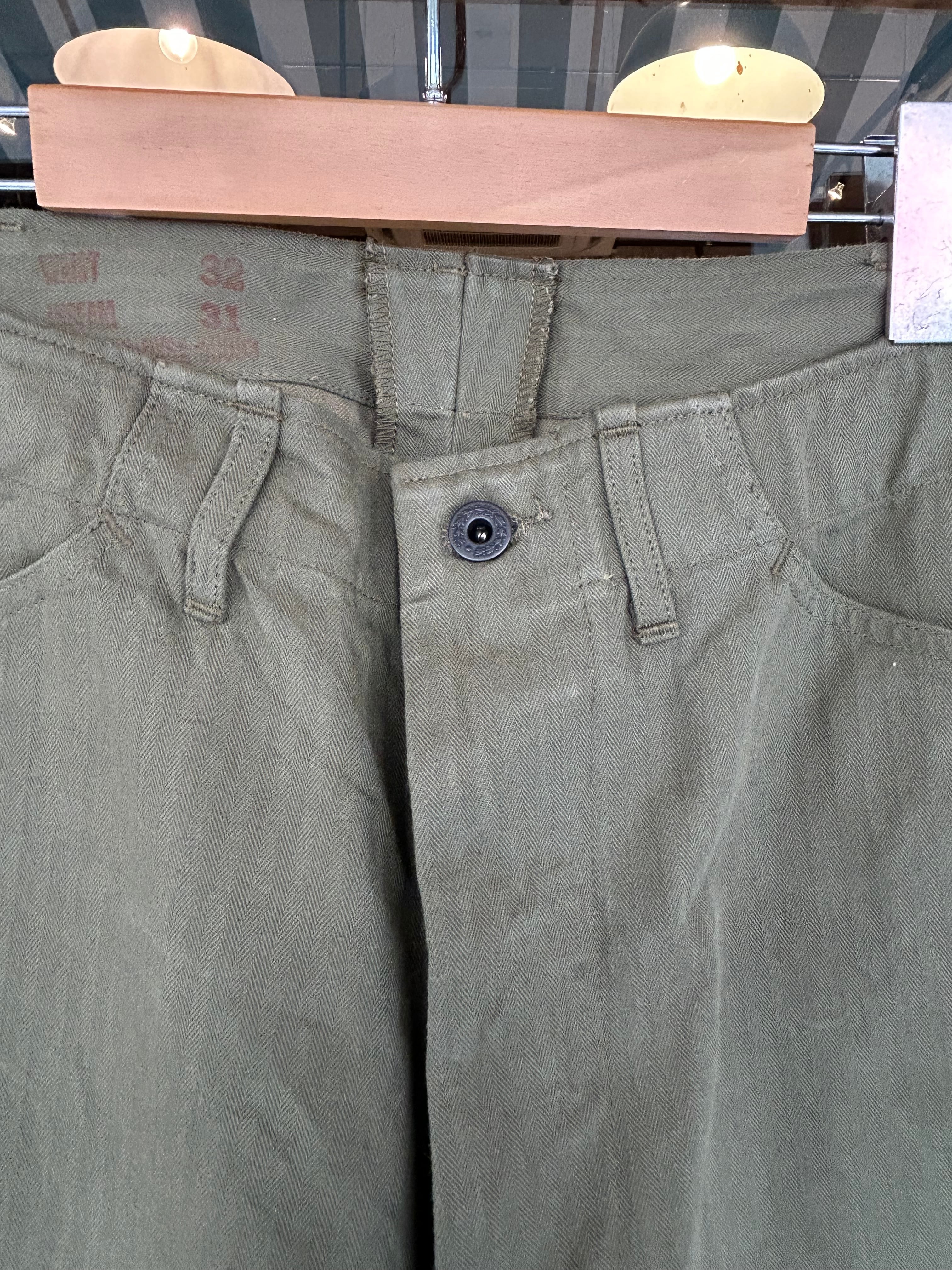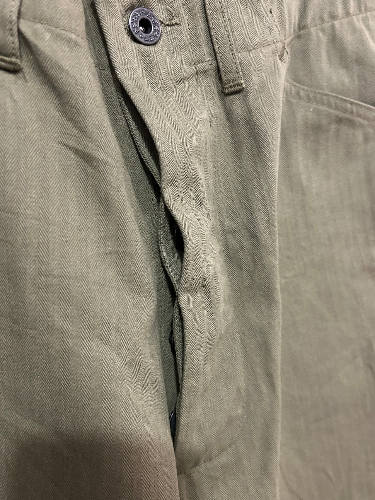 米海軍が1940年代初頭に採用したN-3ユーティリティパンツ。シンプルにヒップポケットが2つついた仕様は同時期に米海兵隊が採用したパンツM-41と同じ外観を持ち、ヒップポケットにマーキングされた『USN』でN-3ユーティリティーパンツと判別する。ボタンは大戦期に使用された黒塗りのドーナツ型タックボタンで月桂樹の刻印が施されている。第二次大戦が勃発し兵士が増員されると装備品の追加生産が急がれ、このN-3のように1つの素材で裏素材からポケット地までを形成したパンツで対応し、量産性に備えた。(BUZZ RICKSON’Sカタログより)