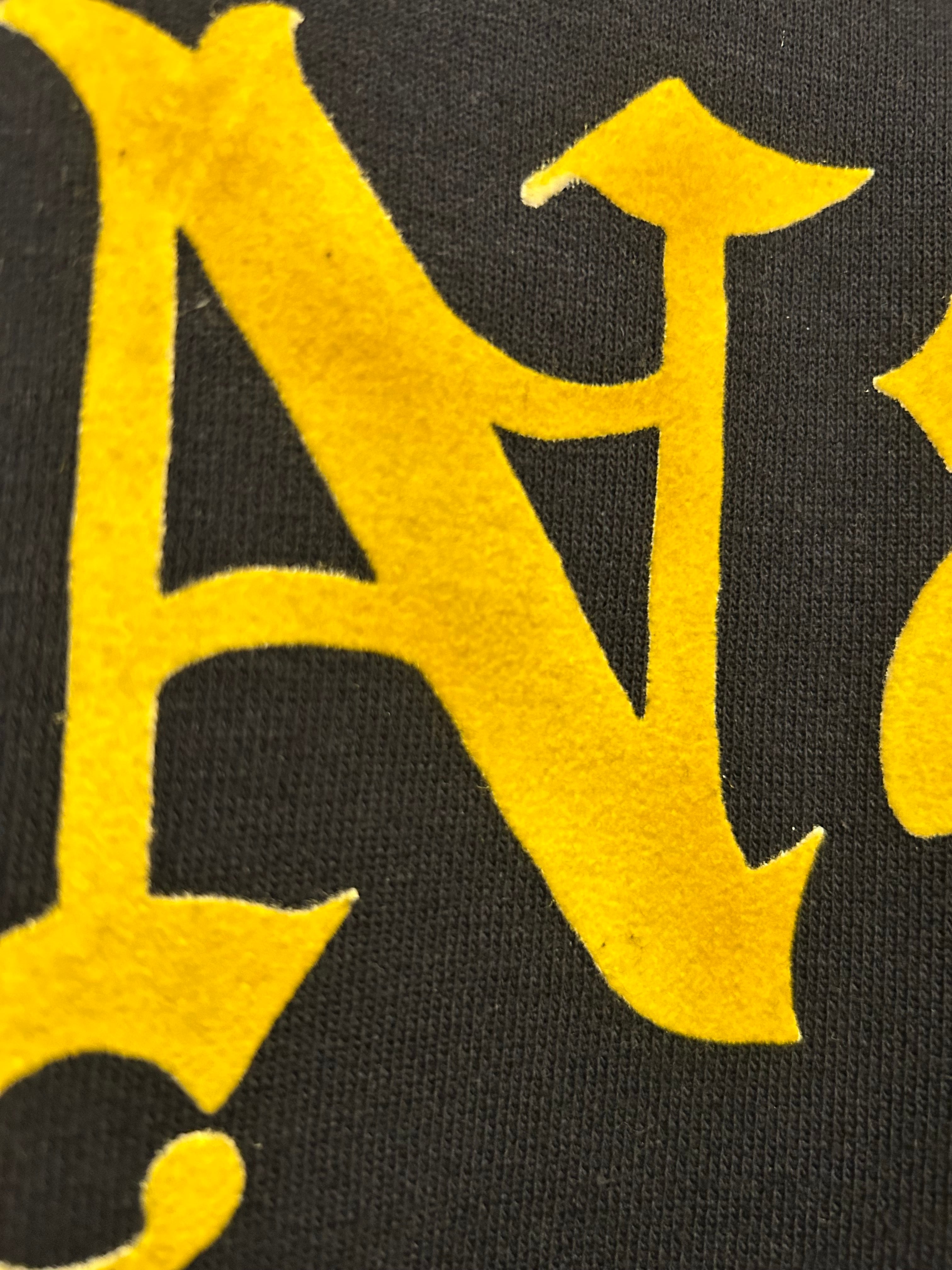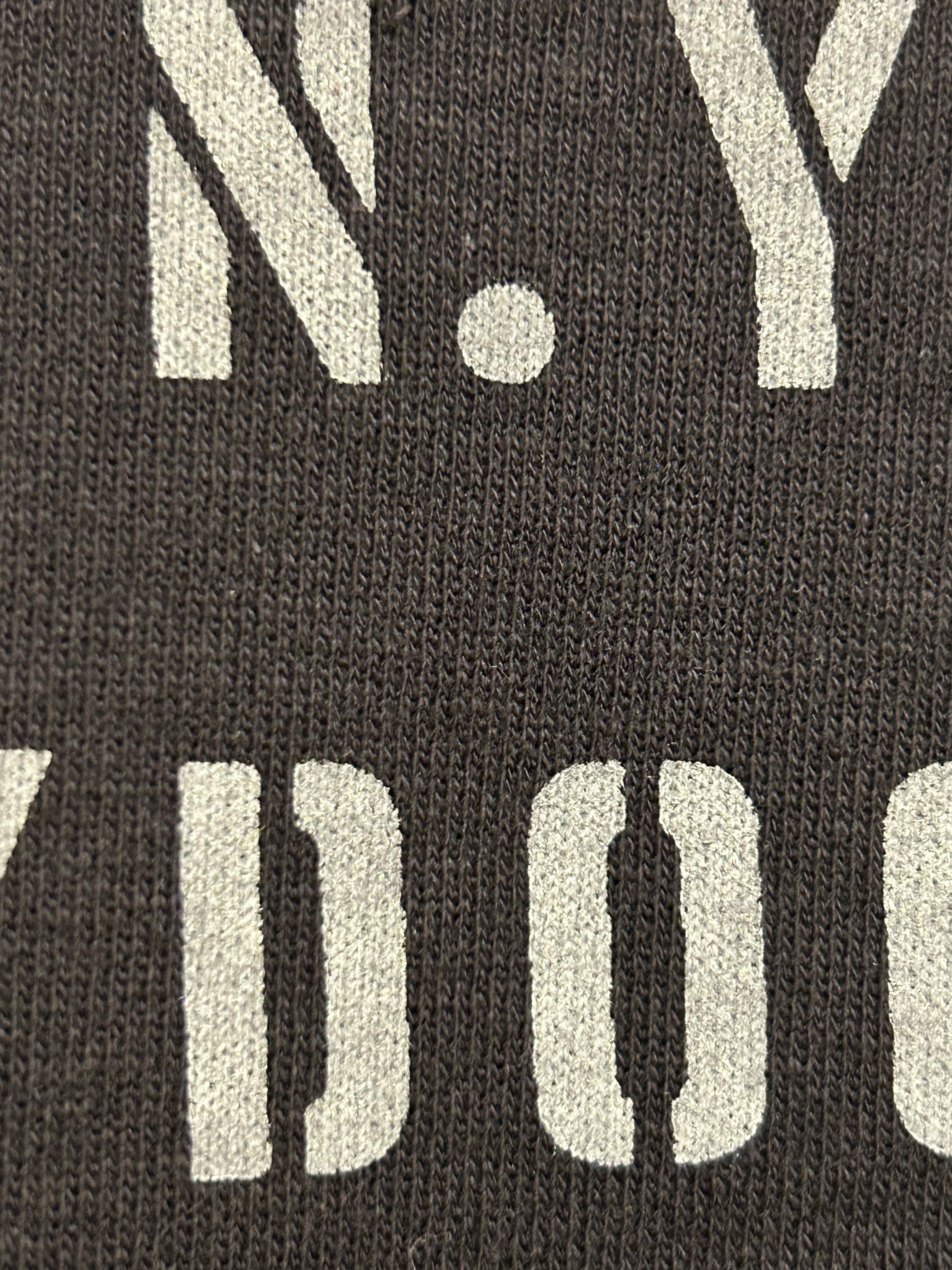ヨークと袖口の部分はリブ生地を使用。フロントには電着で厚みのあるフロッキープリントを、バックサイドはひび割れしてくるラバープリントを施しています。