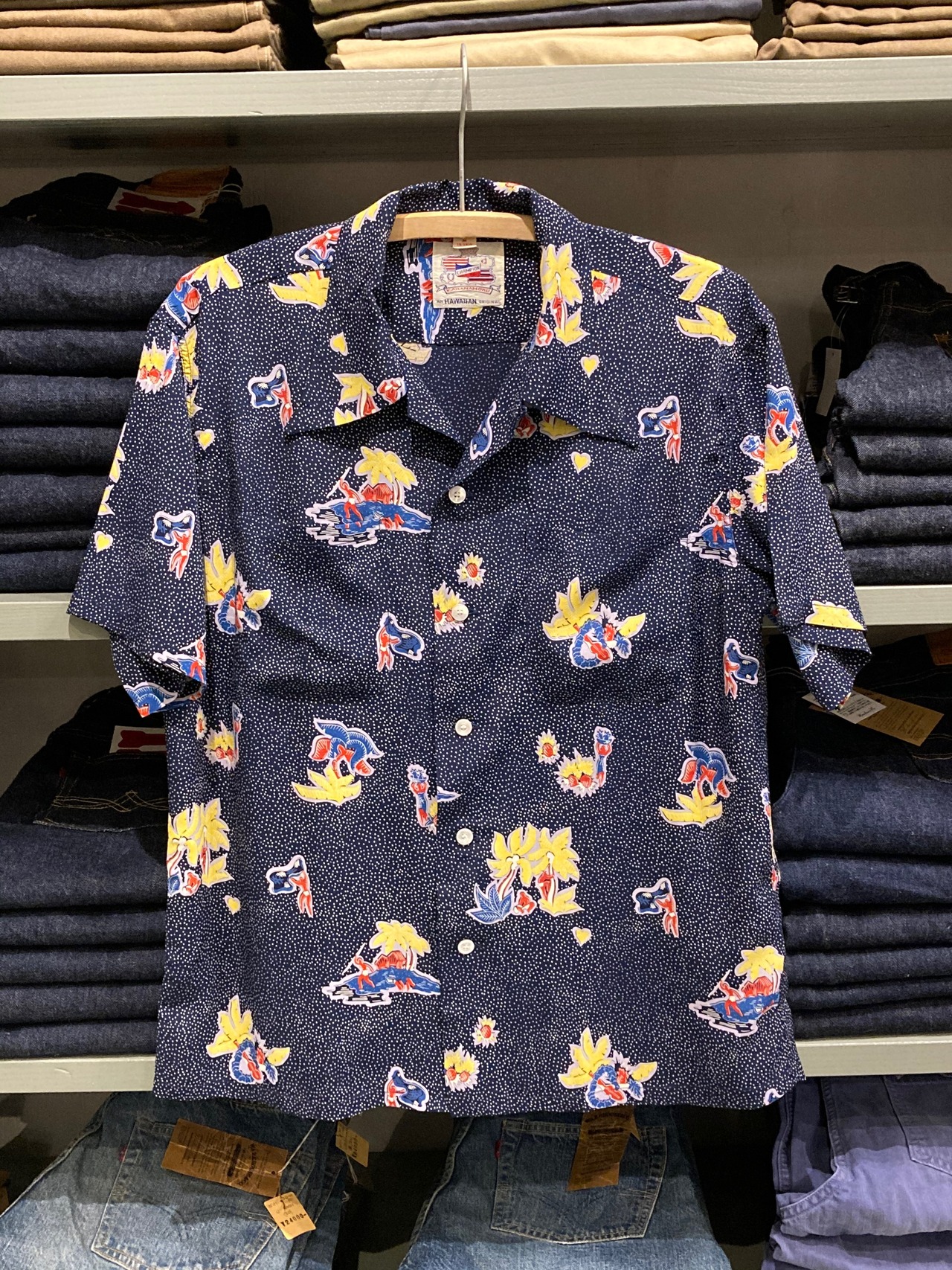 これによりスーベニア(土産物)として生まれたアロハシャツは、時流に乗ったリゾートウェアへと変貌を遂げる。オリンピック競泳のゴールドメダリストであり、サーフィンというスポーツの伝道師でもあり、映画俳優までこなすヂュークの知名度と相まって、ハワイはアメリカ人の人々にとって特別なものとなっていた。今回、初の復刻となるこの作品は、どうブランドの中でも珍しいオールオーバー・パターン(総柄)で構成されている。細かいドットが背景となり、その上にフルーツセラーやパームクライマーなどのモチーフが抽象的に描かれた独創性のあるデザイン。(SUN SURF2021カタログより)