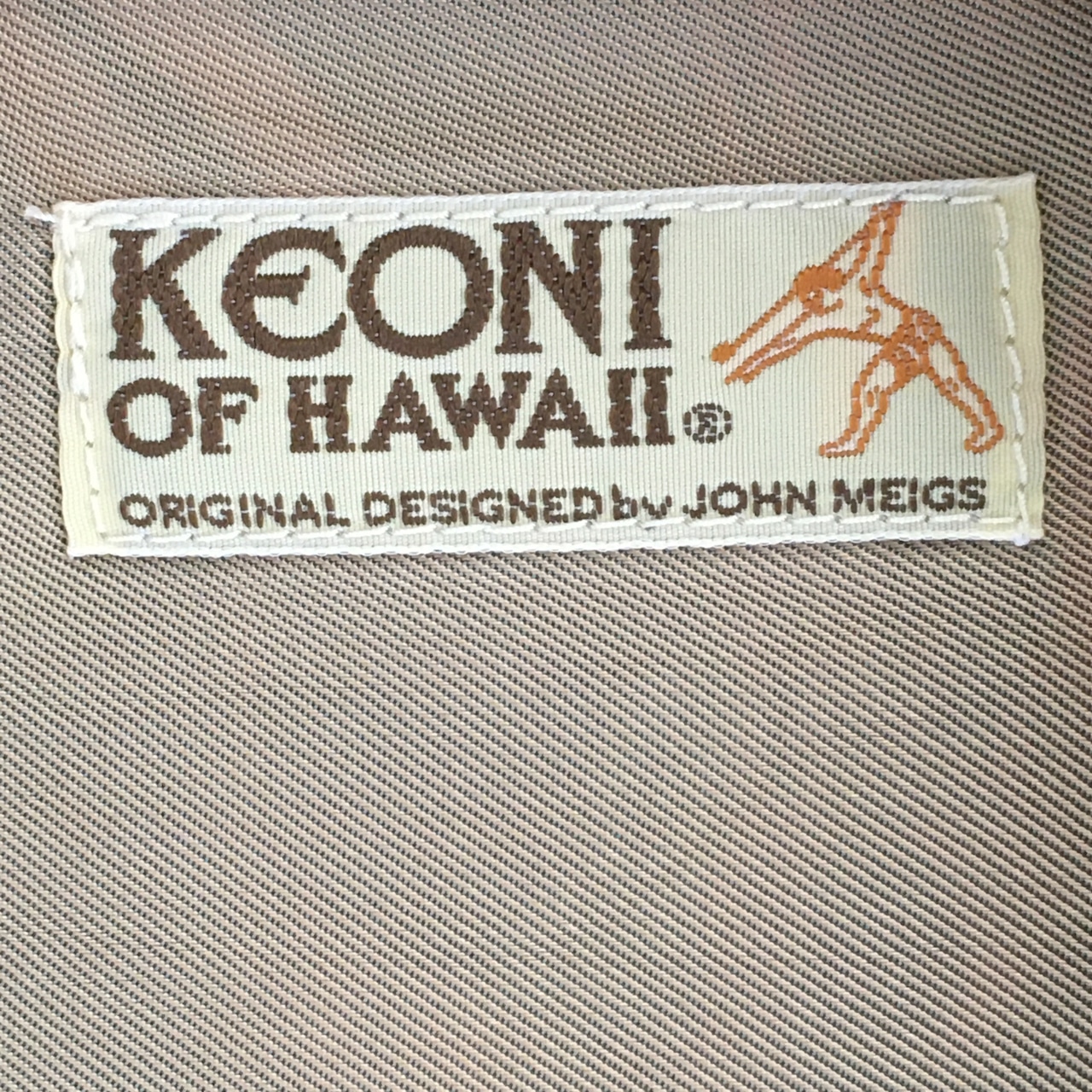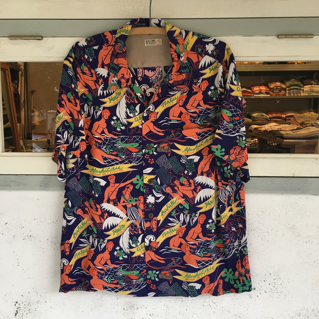 アロハシャツの全盛期であった1950年代。当時活躍したテキスタイルデザイナーの中でもひときわ異彩を放つ人物がいる。それがジョン・メイグス。彼が残した作品群はヴィンテージコレクターから厚い指示を受け、どれも評価が高く、メイグスの作品に魅了されてアロハシャツの収集を始めたコレクターも多い。そんな彼が1940~50年代に手がけたデザインには、当時製品化されておらず、保管されたままとなっていた未発売の作品が存在していた。それらをアロハシャツとして世に放つことをメイグスから託されたのがサンサーフであり、それをきっかけに「ケオニ・オブ・ハワイ」がスタートした。今回登場する「HOOLAULEA IN HAWAII」はメイグス本人の監修のもと、ケオニ・レーベルの最初期である1998年に公開された作品。モチーフとなっているのはサンフランシスコとハワイの間を航行していた豪華客船「マトソン・ライン」のレストランで使われていたメニューの表紙。画家ユージン・サベージが手がけたメニュー・デザインをもとに、それらを平面構成し直したのが本作である。毎年寄せられる多くのリクエストに応え、’98年当時は製品化されなかった配色とともに、実に23年ぶりに伝説が蘇る。