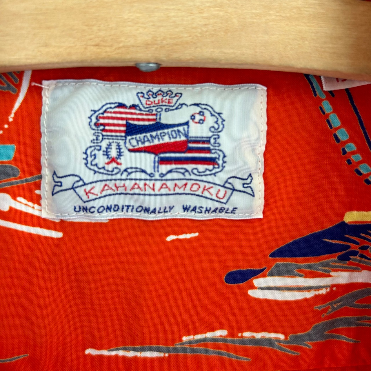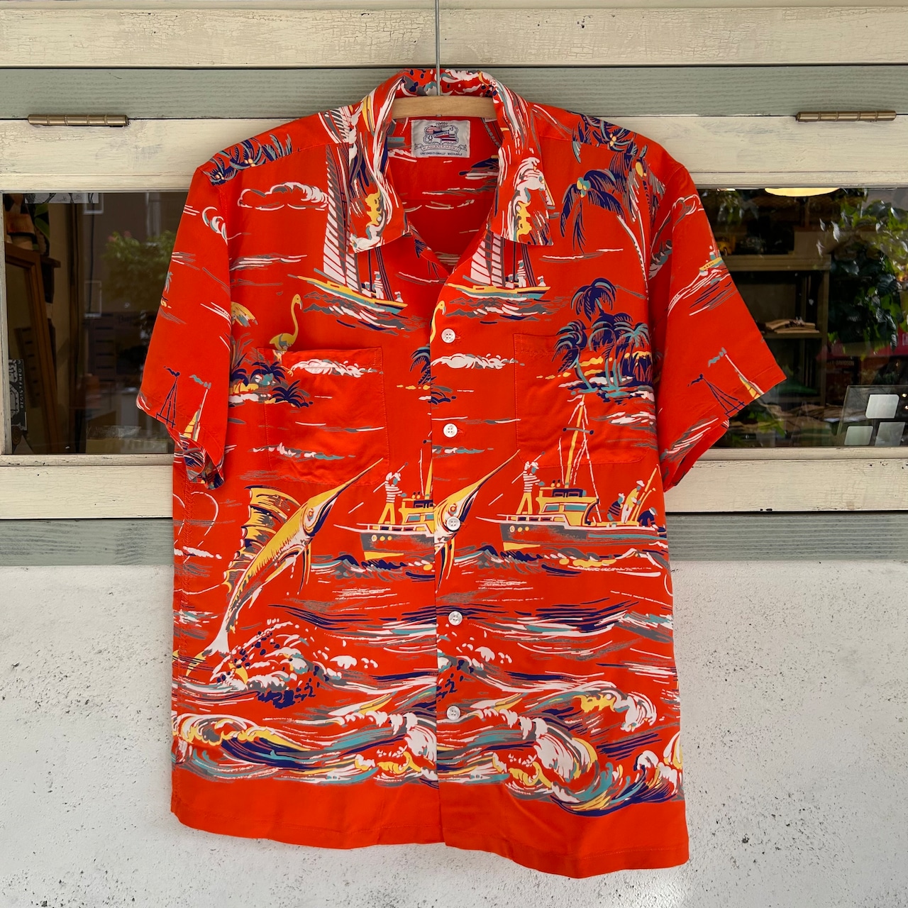 アロハシャツが本土でリゾートウェアとして不動の地位を築くことのできた大きな要因のひとつがデュークの活動であった。そしてゴルフやトローリングなど、ハワイのブランドがあまり描かなかったモチーフも増えていく。特にこの作品のモチーフとなっているトローリングは、フロリダやカリフォルニアなどのアメリカを代表するリゾートウェアで人気のアクティビティであったことから、アロハシャツにおいても人気のデザインとなっていった。<SUN SURF2023カタログより>