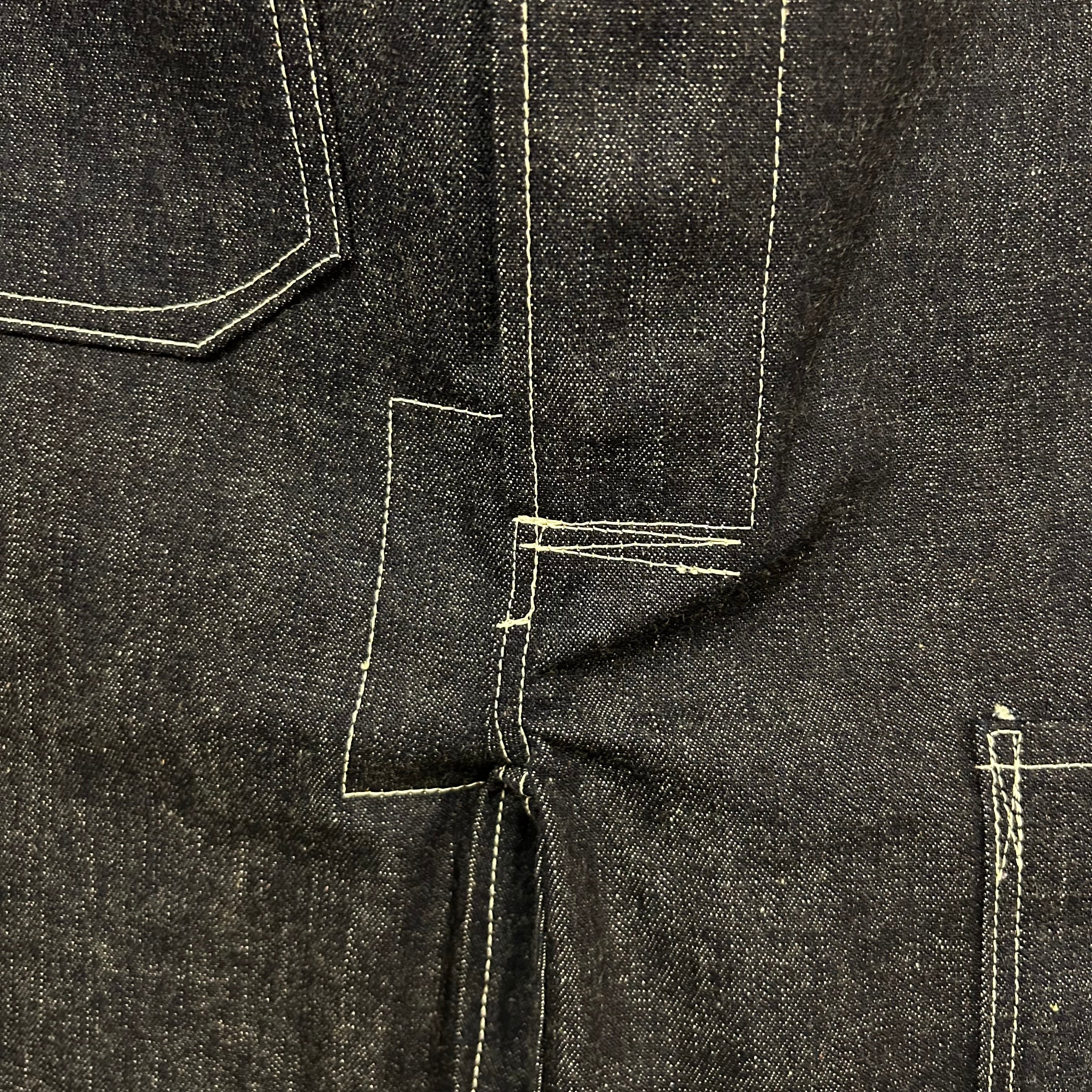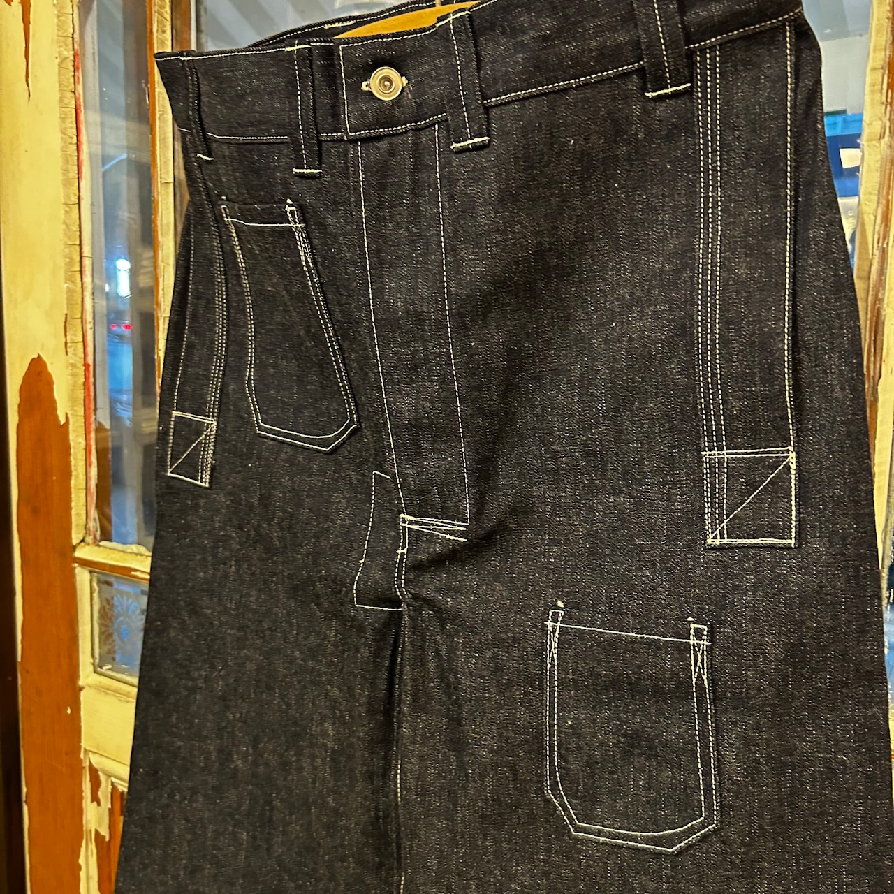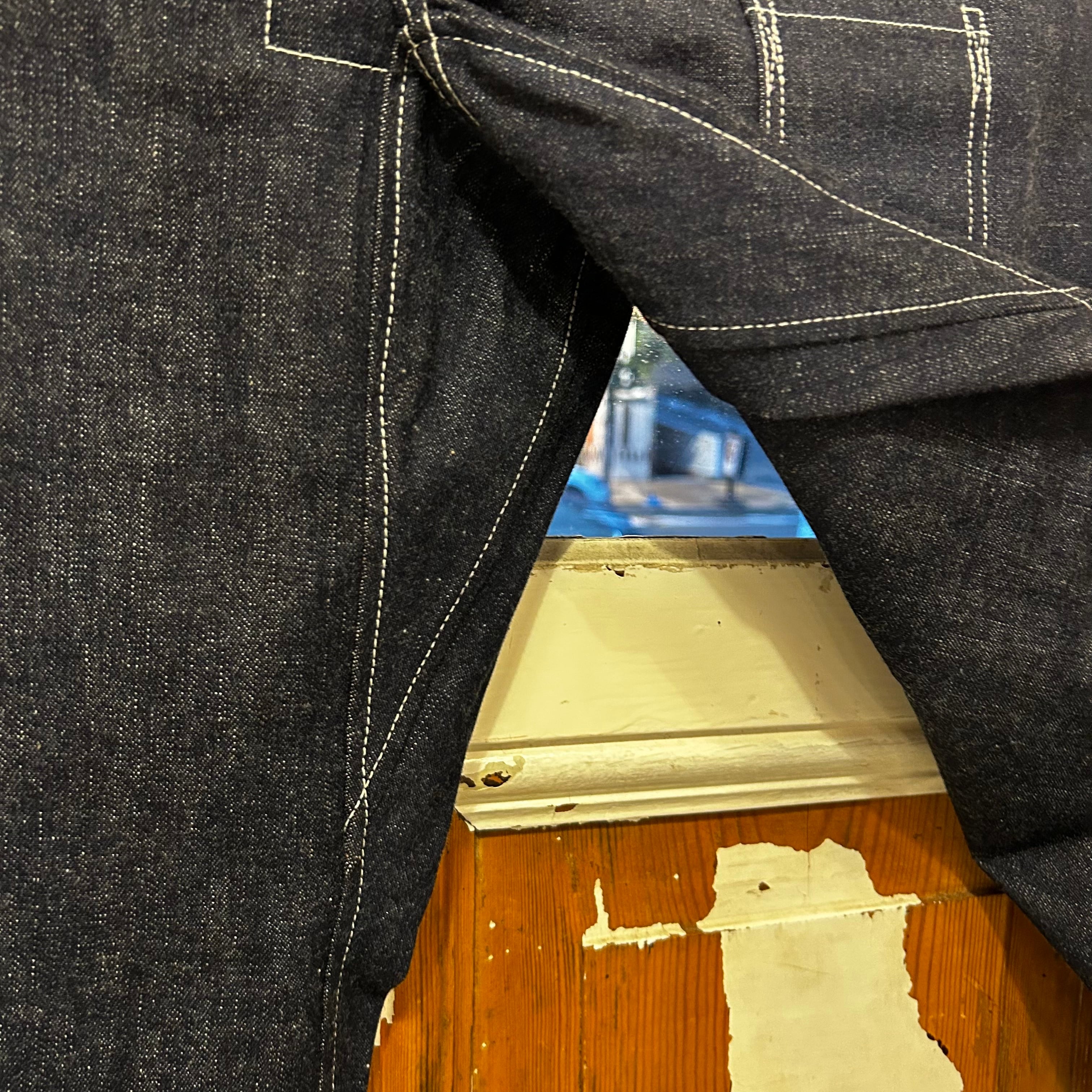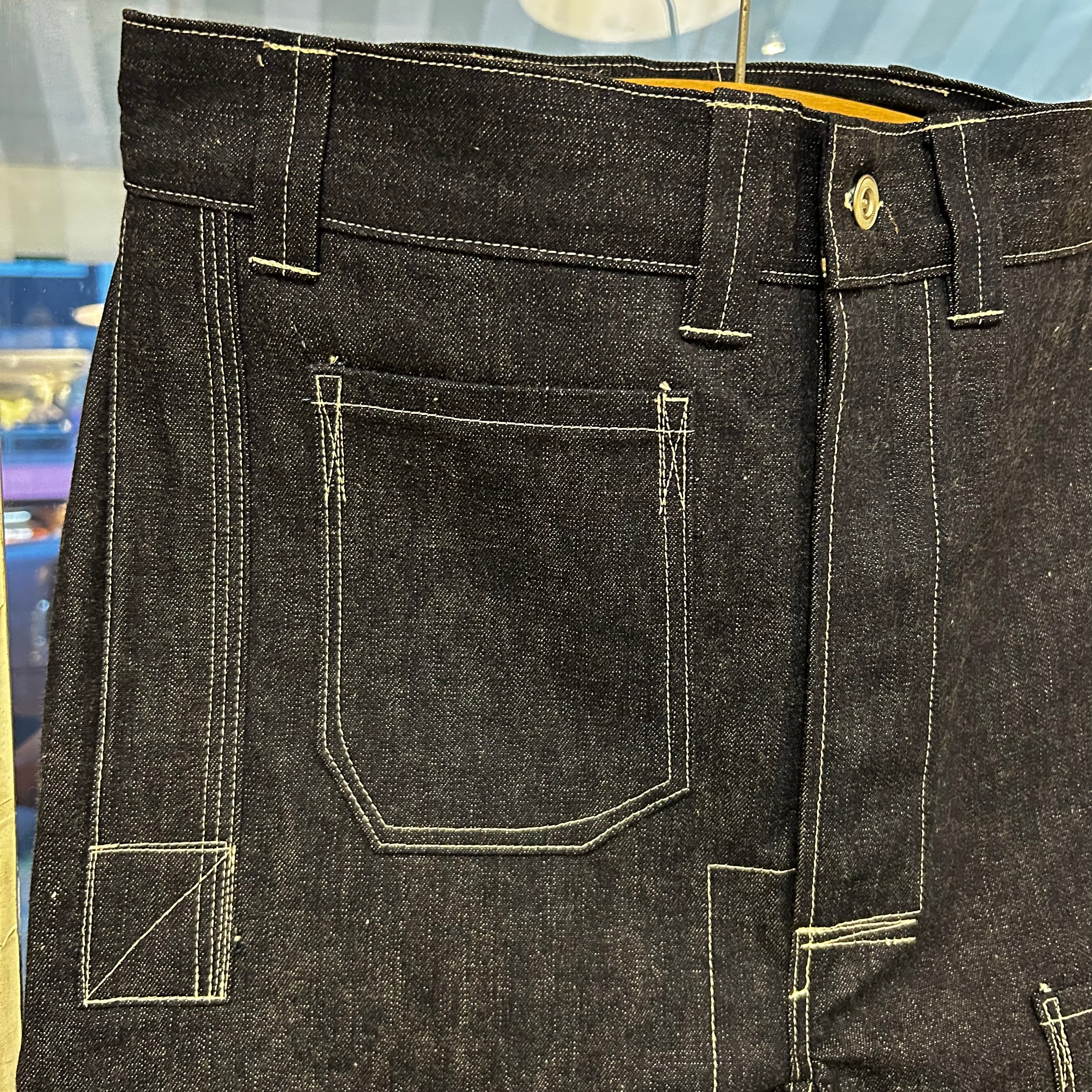 当時、目的をもって作られたと思われるポケットのサイズや形、そして配置はとてもユニークなものです。ヒップから股下にかけて三角マチでわたり幅を出しています。