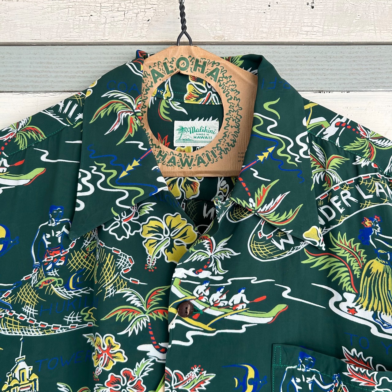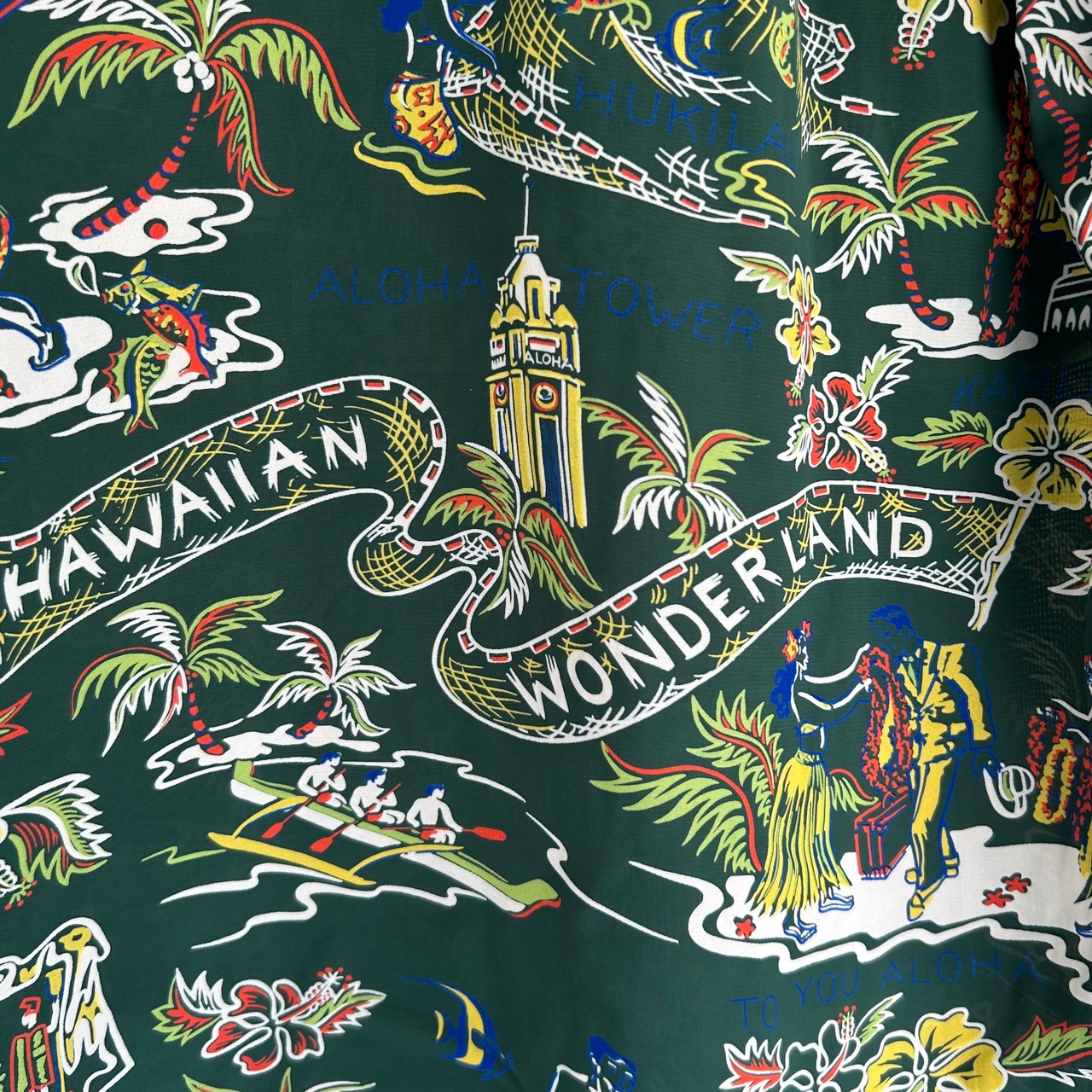 ヴィンテージアロハシャツにおいて、数多く制作されたチャプスイ柄。その中でも特にインパクトが強く、優れたデザインとして有名なのがこの「ハワイアン・ワンダーランド」。コレクターからの人気も高く、実名での復刻は2度目となる。フラガール、アロハタワー、カメハメハ大王像、ハワイアンクレスト、フィッシャーマンなどの人気モチーフに加え、絵柄の中心を流れるバナー(横断幕)には「HAWAIIANONDERLAND」の文字が大胆に描かれたコレクタブルな一枚。