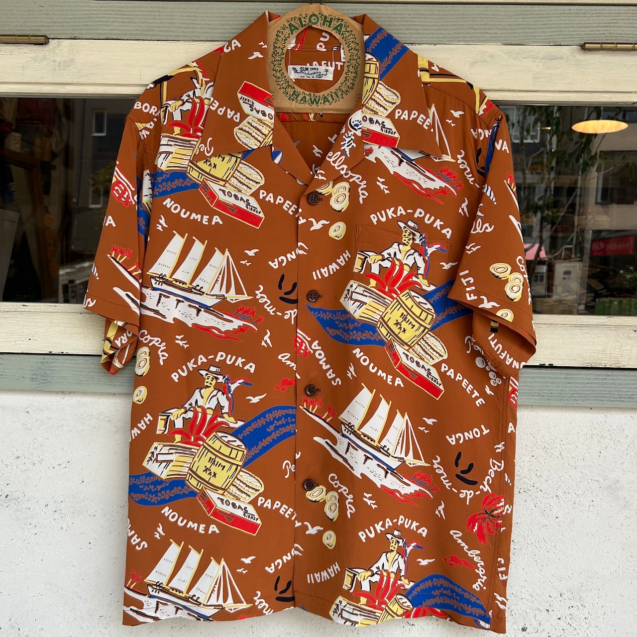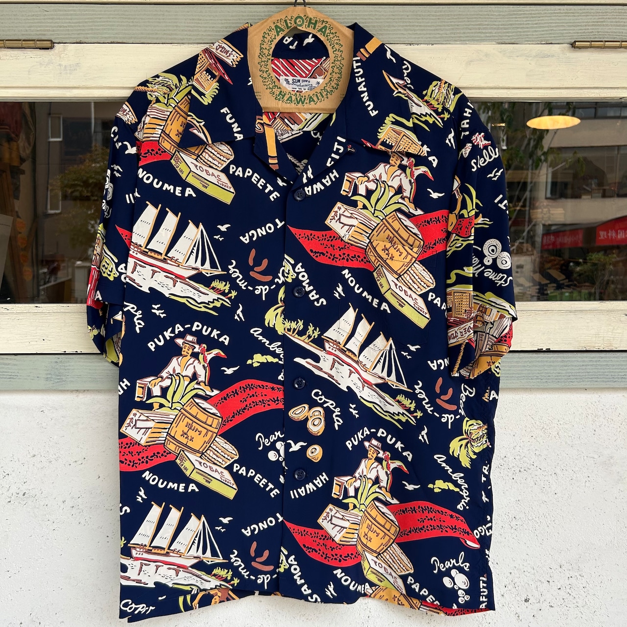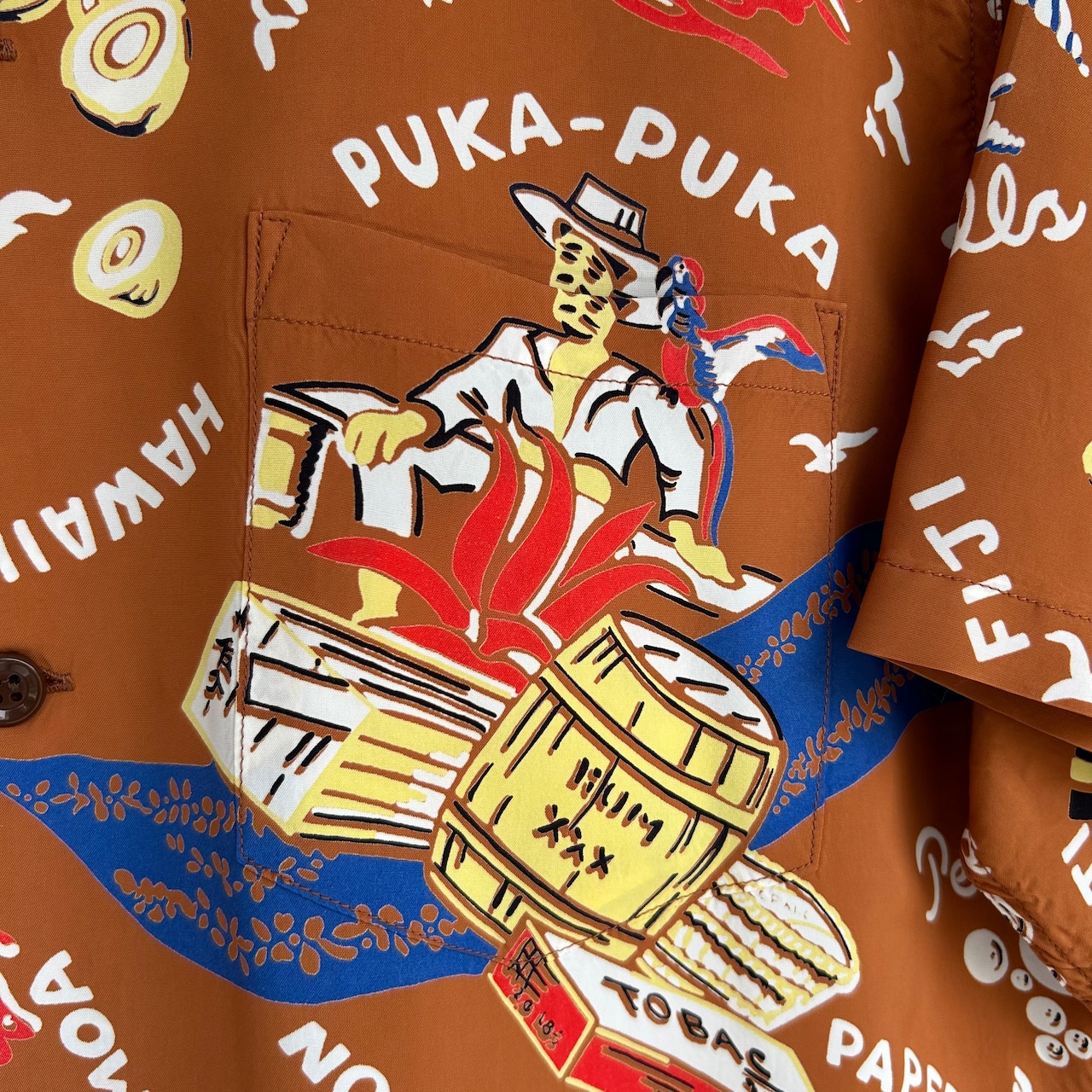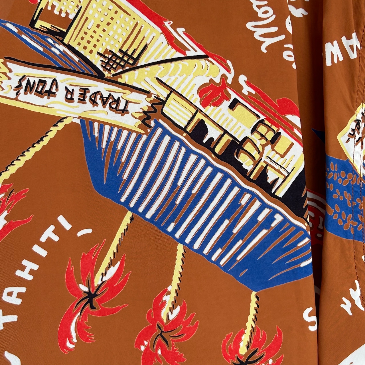 数あるヴィンテージ・アロハシャツの中でも非常に人気の「サウス・シー・トレーダー」。当時、テキスタイル・デザインの頂点に君臨していたデザイナー、ジョン・メイグスが手掛けた作品で、彼の憧れであったポール・ゴーギャンが活躍したタヒチをはじめ南太平洋の島々を題材にしており、特別な思い入れがあると語っていた。柄にメイグス本人が貿易商「トレーダー・ジョンズ」として描かれているところも彼らしいユーモアのセンスに溢れた一枚。
