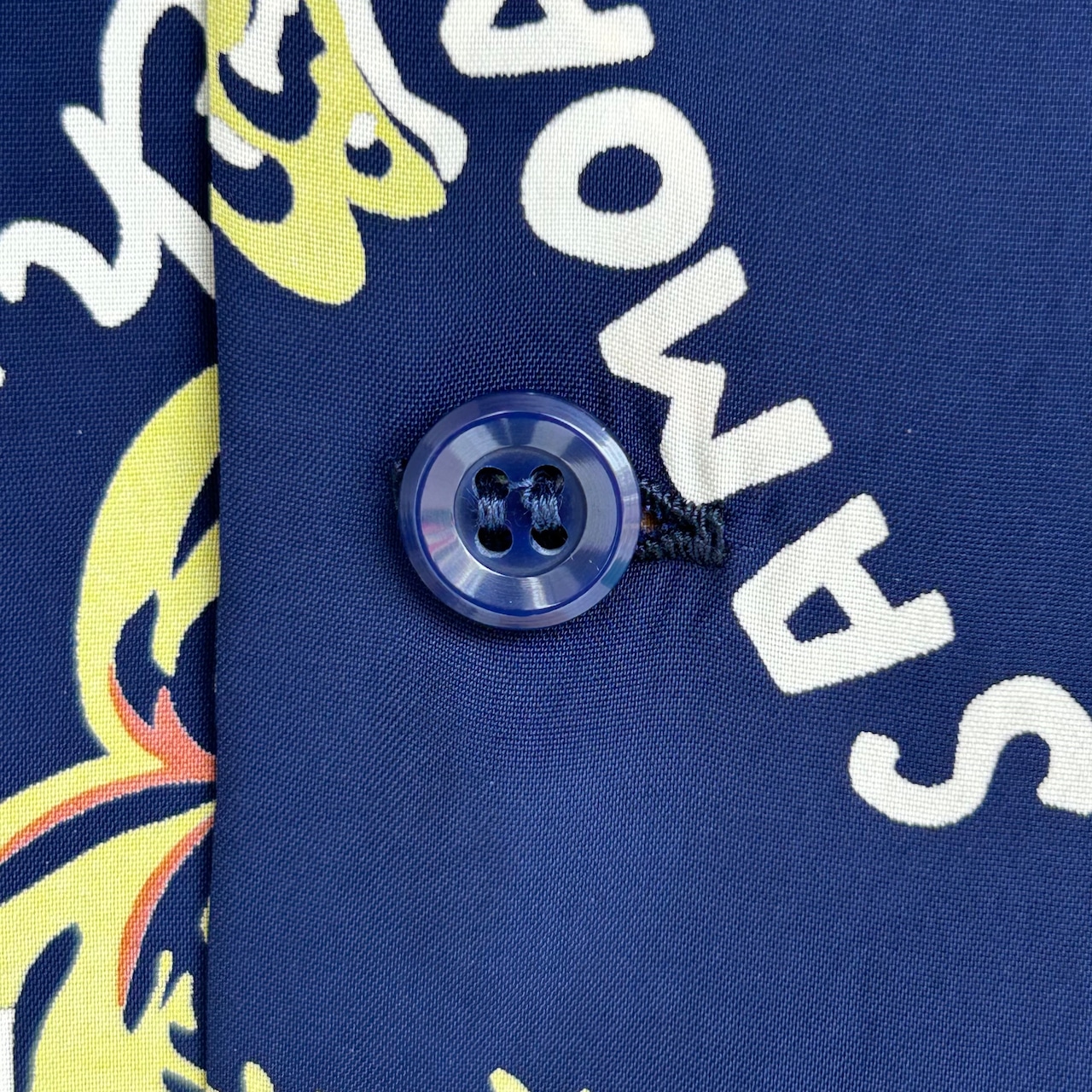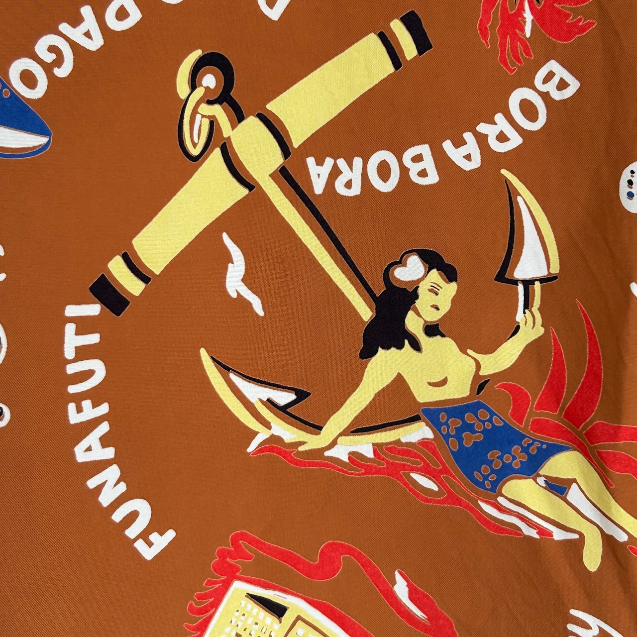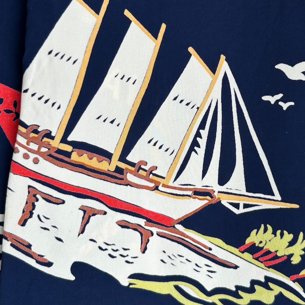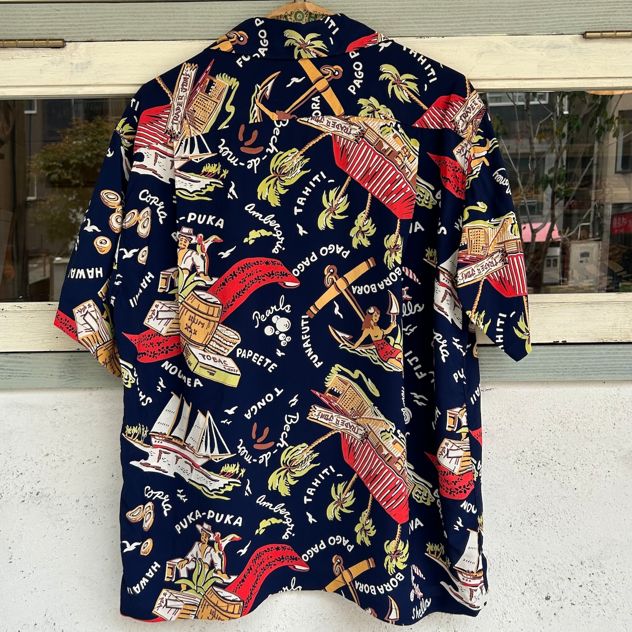 数あるヴィンテージ・アロハシャツの中でも非常に人気の「サウス・シー・トレーダー」。当時、テキスタイル・デザインの頂点に君臨していたデザイナー、ジョン・メイグスが手掛けた作品で、彼の憧れであったポール・ゴーギャンが活躍したタヒチをはじめ南太平洋の島々を題材にしており、特別な思い入れがあると語っていた。柄にメイグス本人が貿易商「トレーダー・ジョンズ」として描かれているところも彼らしいユーモアのセンスに溢れた一枚。