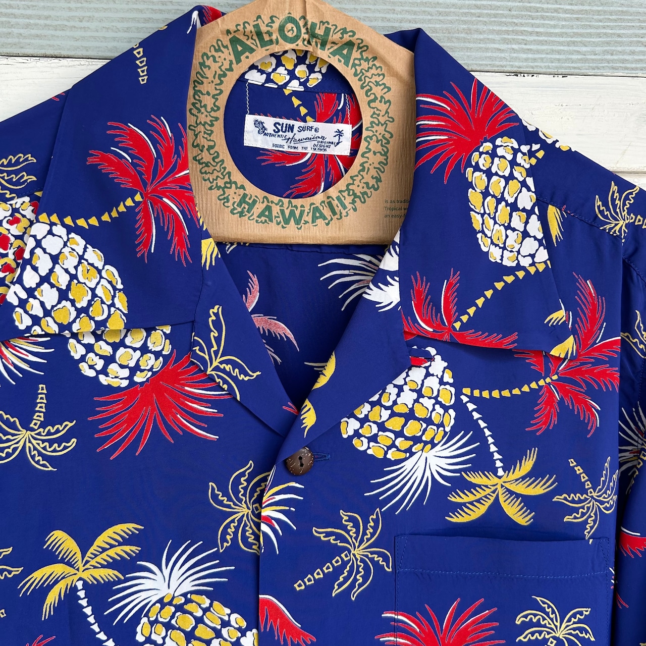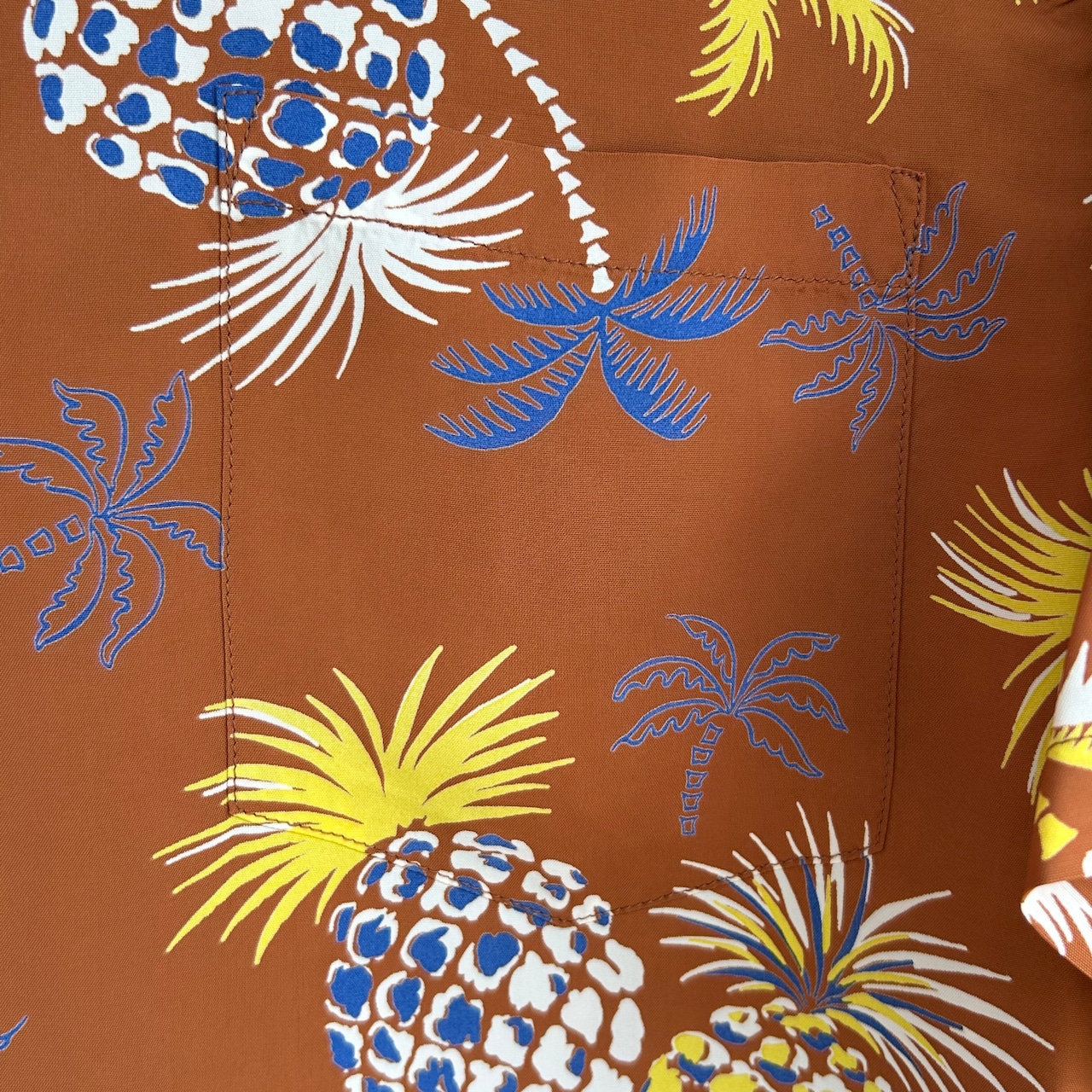 レーヨン素材だけでなく、コットン素材のアロハシャツも数多く展開していたアメリカ本土のブランド、マイラン。モチーフの存在感やインパクトを重視する柄ではなく、1950年代のアメリカ本土らしい定番的なモチーフを散りばめた総柄で人気を集め、全米に取引先を持っていた。今回紹介するこのシャツもヤシの木とパイナップルをモチーフにしたシンプルなデザインではあるが、万人に愛される柄で、同ブランドらしさが表れた作品となっている。