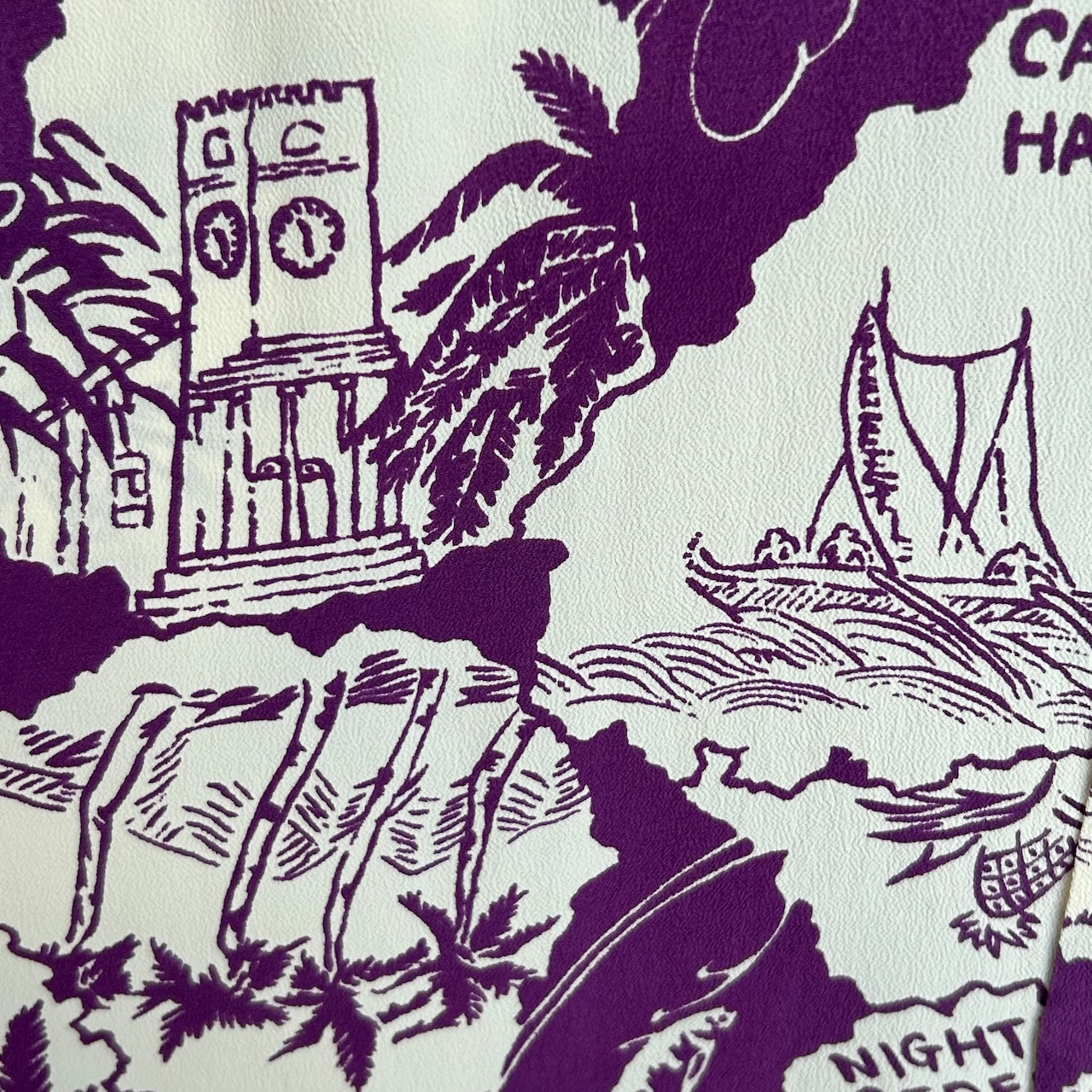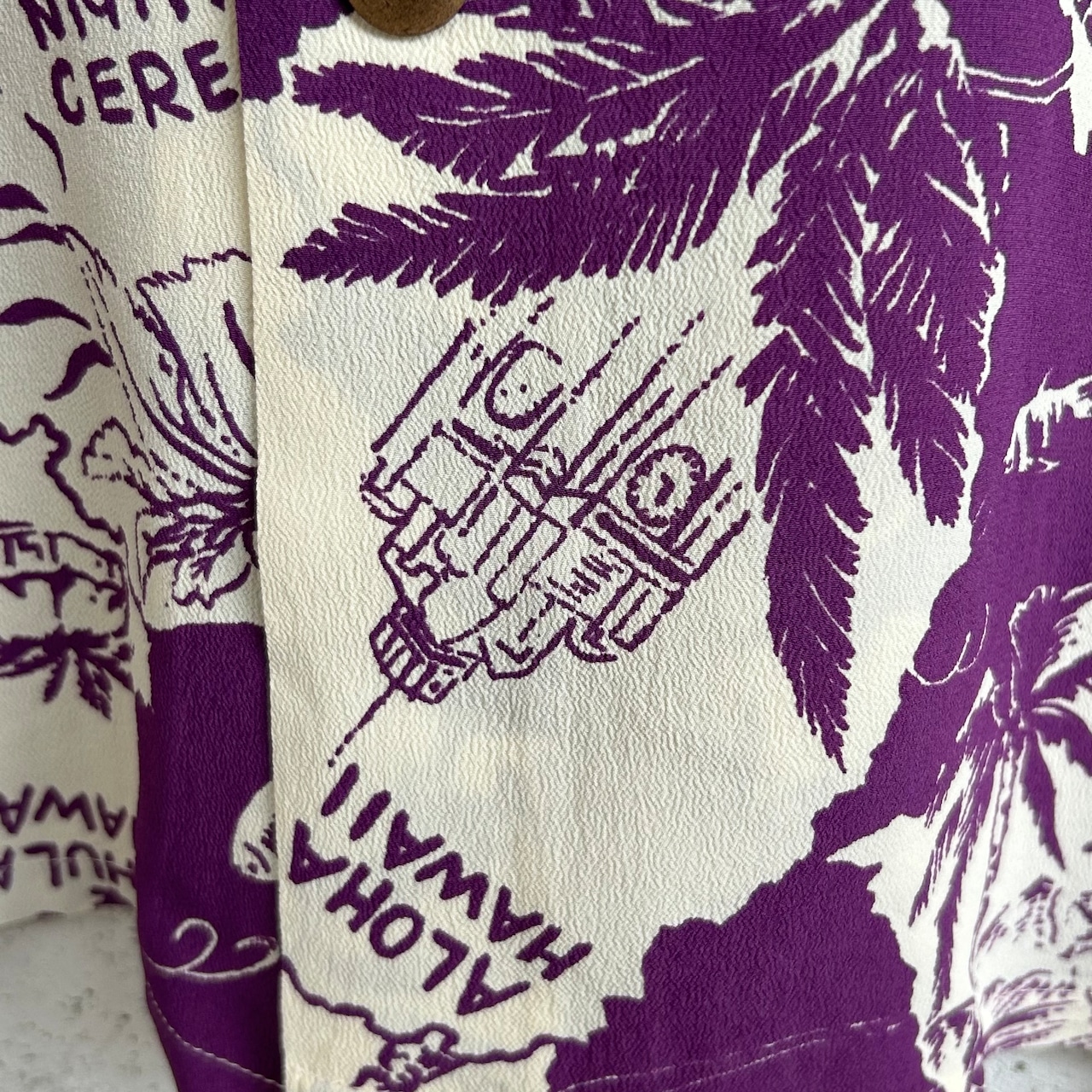 フラガール、ダイヤモンドヘッド、そして楽園ハワイを象徴する、アロハタワーやパイナップルなどがシンプルな単色使いで表現された味わい深い一枚。祖国日本を思いながら現地ハワイで暮らす移民で渡った人たちの思いが伝わってくる。デザインの描かれ方やプリント、シャツのディテールなどから最初期に製作されたものであるとわかる。デザインのアイディアやディテールをハワイで組み、最終のスケッチから型の作成、捺染などは日本の職人に託され作られた一枚。作品制作のためにハワイから送られてくる写真や雑誌などの資料をもとにデザインが描かれていった。